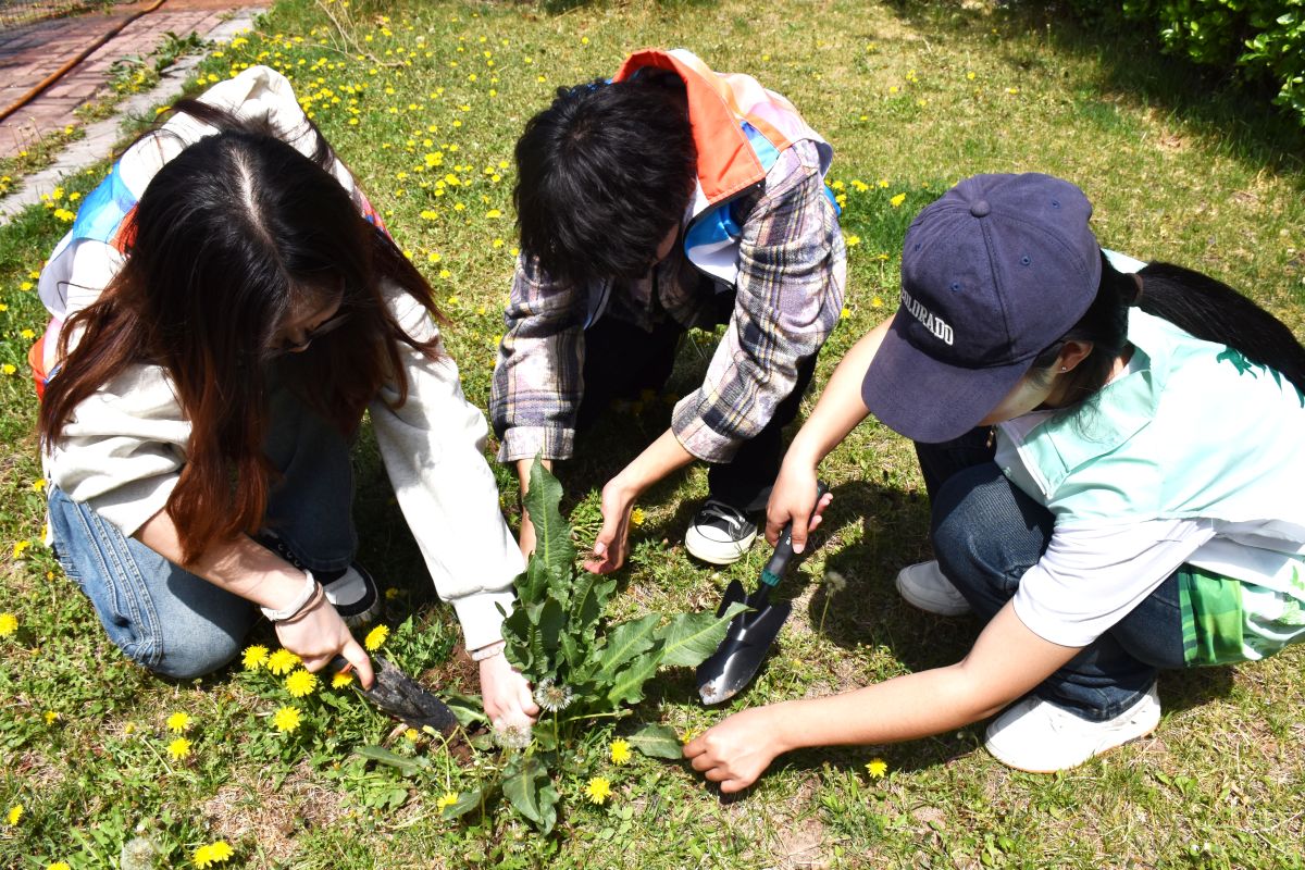 快问快答环节,同学们化身“野菜特工”,面对“蒲公英的种子如何远行?”“荠菜的叶缘为何锯齿?”等问题,抢答声此起彼伏。随着戴铭成老师一声“行动!”,校园秒变“野菜探秘基地”。师生手持工具俯身拨开草丛——“看!荠菜的锯齿叶缘是天然防伪标志!”张丹老师举起蒲公英的伞状花序:“这‘小降落伞’藏着自然传播的智慧!”在老师的指导下,同学们纷纷穿梭于教学楼后的草坪、图书馆旁的花坛,仔细寻找藏在绿意中的野菜踪迹,让校园的每个角落都洋溢着探索自然的热情。