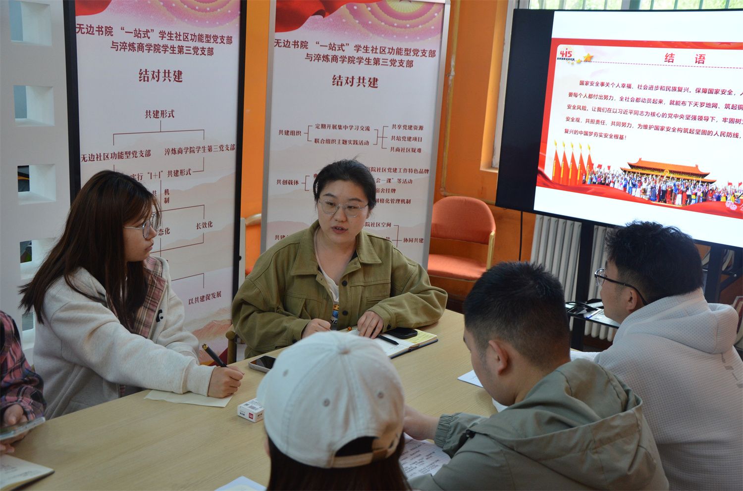4月19日,无边书院“一站式”学生社区功能型党支部与淬炼商学院学生第三党支部携手开展了【青年之家】第6期:结对共建党支部书记面对面。此次活动以“全民国家安全教育日”为主题,邀请淬炼商学院党总支部组织委员、组织员郝琛琛和淬炼商学院学生第三党支部宣传委员张晓倩深入无边书院,与无边书院“一站式”学生社区功能型党支部组织委员王雅坤面对面解决实际问题,与学生党员面对面交流。