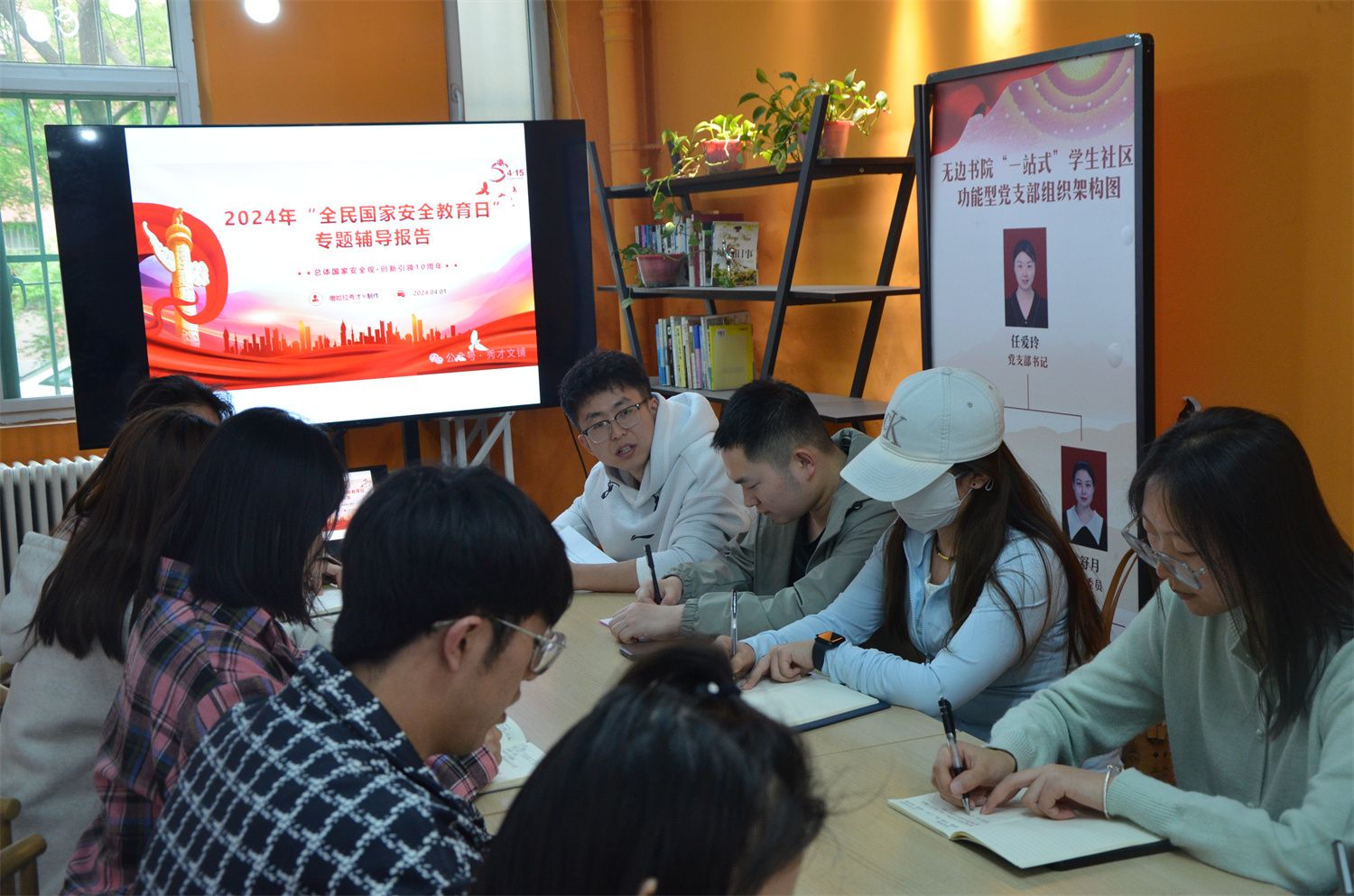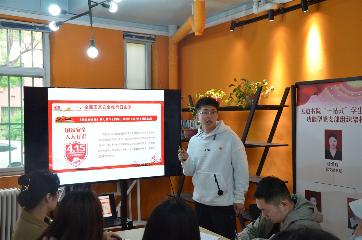 深入了解,方能实现真正的共建和共赢。郝老师对国家安全的阐述,让每位同学都深感责任重大。紧接着,无边书院“一站式”学生社区功能型党支部组织委员王雅坤老师就书院育人体系、阵地空间以及学生政治面貌等方面向同学们进行介绍。王老师首先提到无边书院作为一个综合性的学生社区,其育人理念是打造“自我发展和社会责任”双平衡的无边人。她提到书院可为其进行场地支持以及活动支持,为学生们搭建了一个展示自我、交流学习的平台。王老师的介绍让在场同学们对无边书院有了更加深入全面地了解。随后王老师与郝老师就实施党员宿舍挂牌与共建支部党员品牌活动等问题进行深入讨论。
