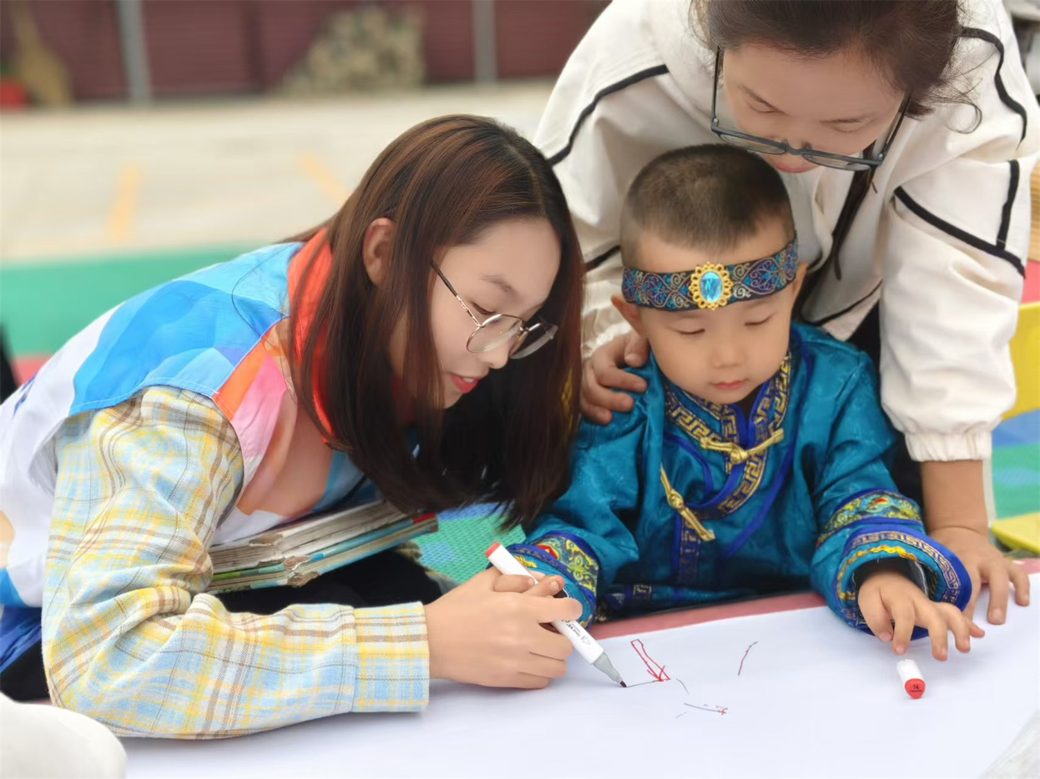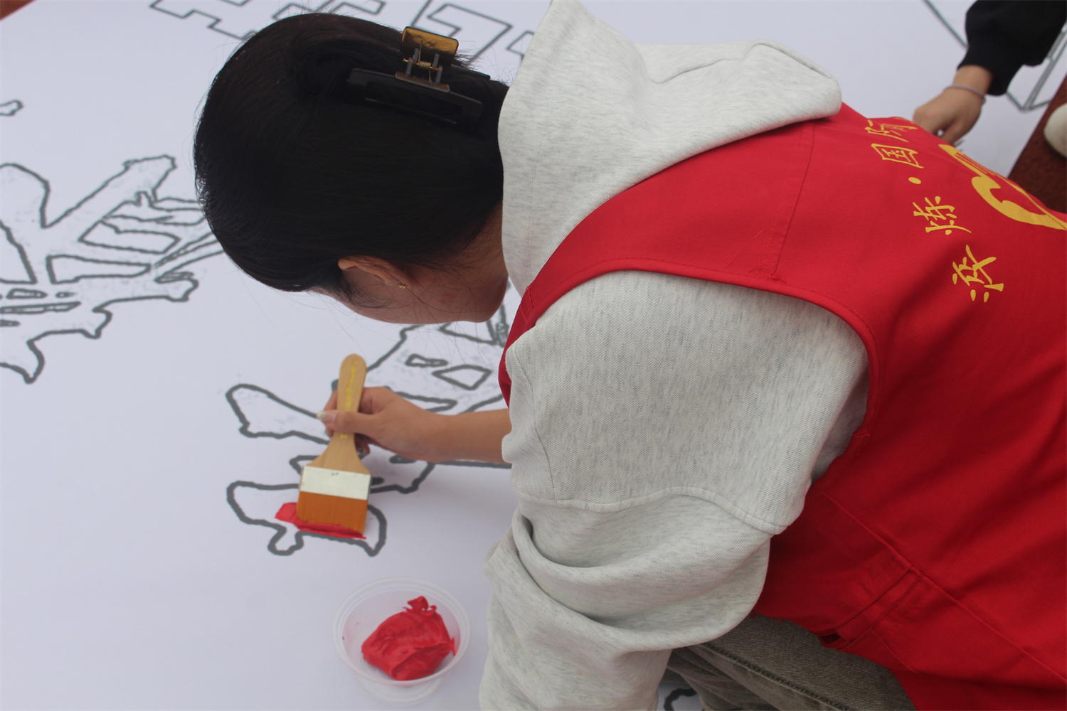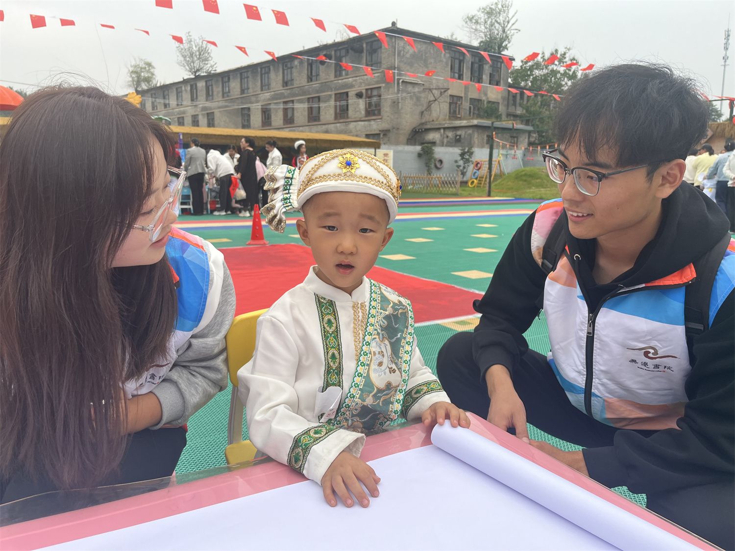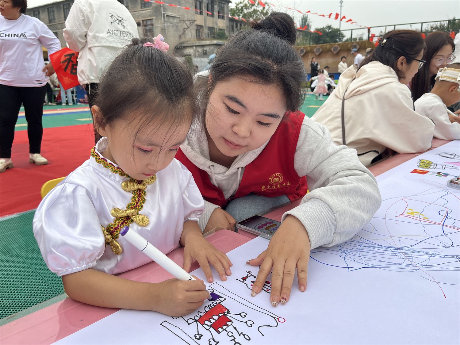 小小的胸膛,大大的情怀,双院以欢度国庆为契机,带领学生党员走进桃园堡幼儿园联合开展了“绘卷画山河,照耀心中红”活动。学生党员带领三十三名小朋友们在白色画布上绘出了自己心中祖国的样子。一座座高大的建筑拔地而起,居民楼下小朋友手拉手玩着游戏,天空中还有自由飞翔的鸟儿,这就是小朋友们心中的美好祖国。他们用稚嫩的笔触、鲜明的色彩共同勾画出一幅盛世景象,此刻,爱国的情怀在他们心底生根发芽。