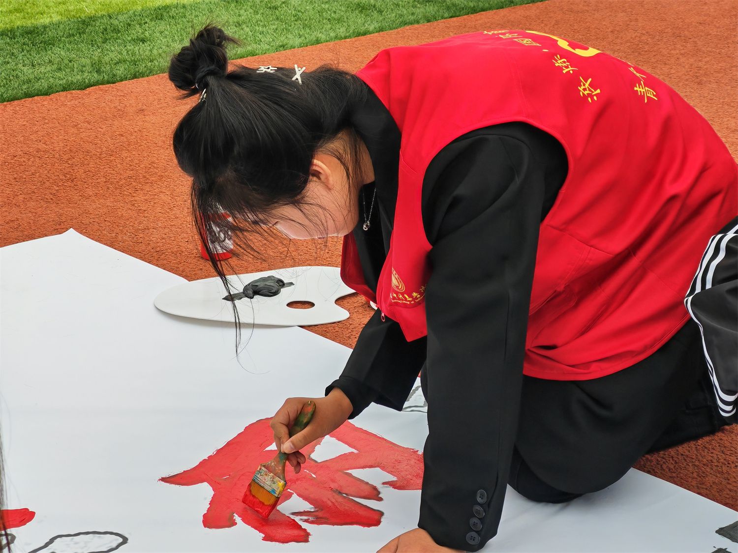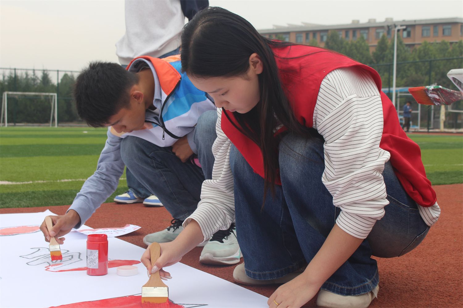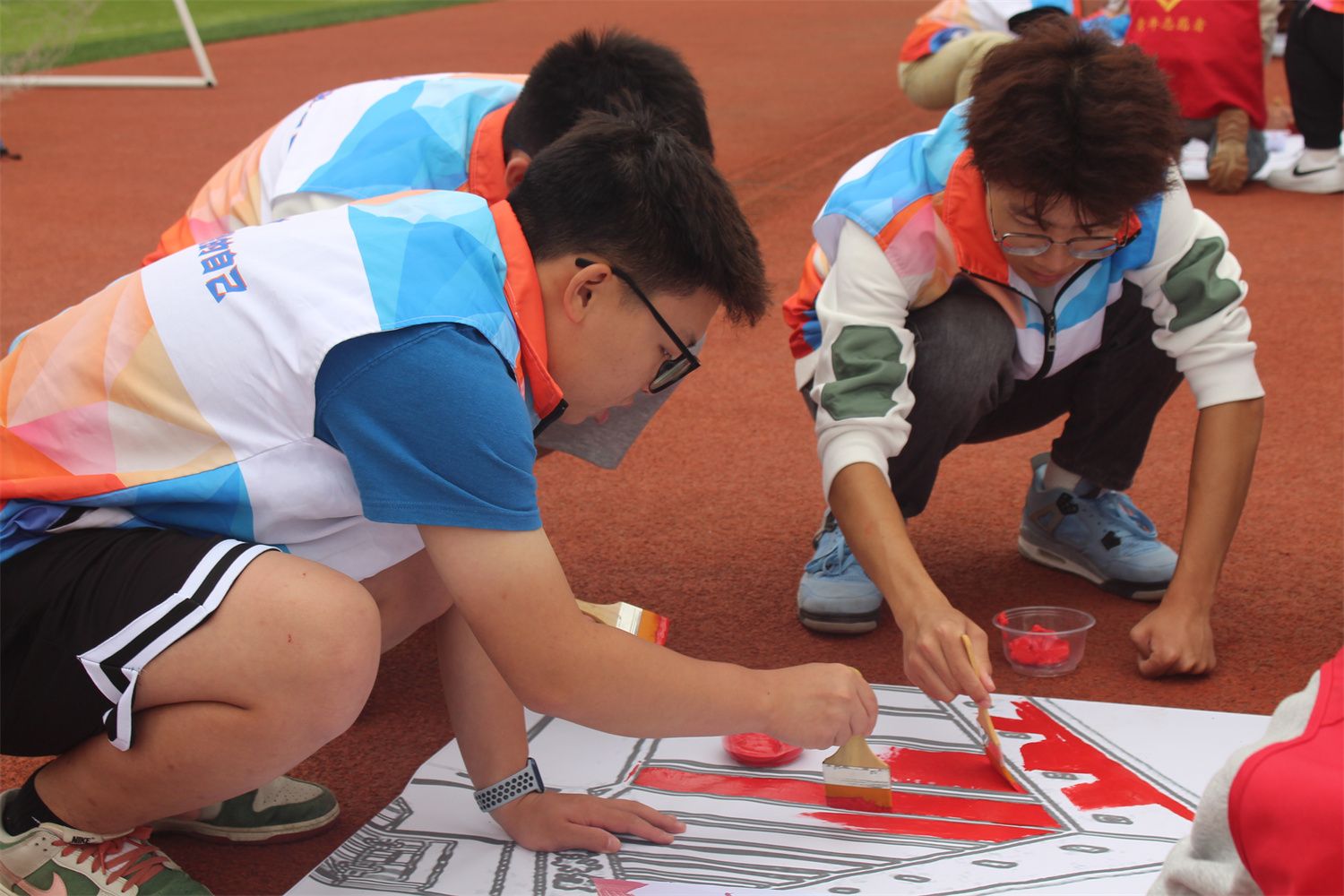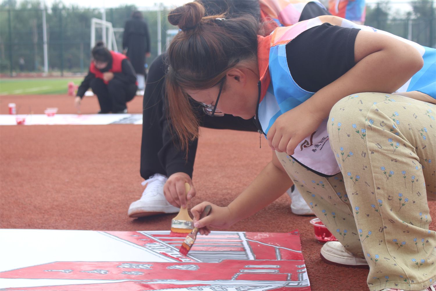 双院三十余名党员师生共聚体育公园,为祖国母亲献上了名为“奋斗是青春最亮丽的底色”的纳斯卡巨画。同学们趴在画稿旁小心翼翼地勾勒着一笔一画,呼吸与绘画的节奏融为一体。不一会儿,乌马河剧院、艺术楼、六扇门等学校代表性建筑便跃然纸上,画布上游走的线条,如同一首无声的诗歌,讲述着青春的故事。从最初的大笔泼墨,到最后的细细勾勒,无不浸透着对祖国的热爱。