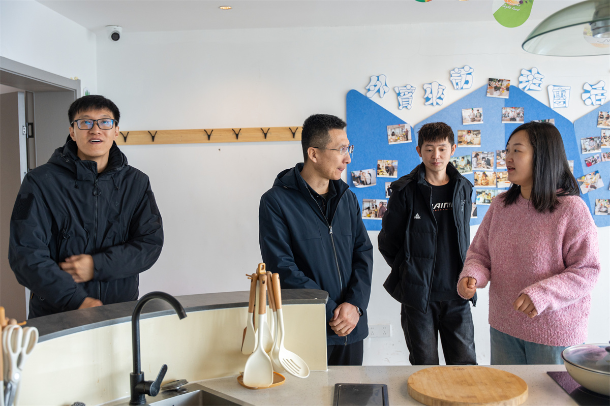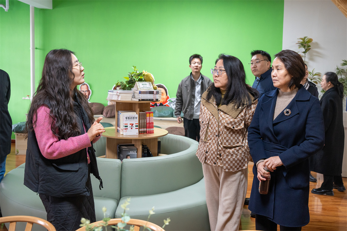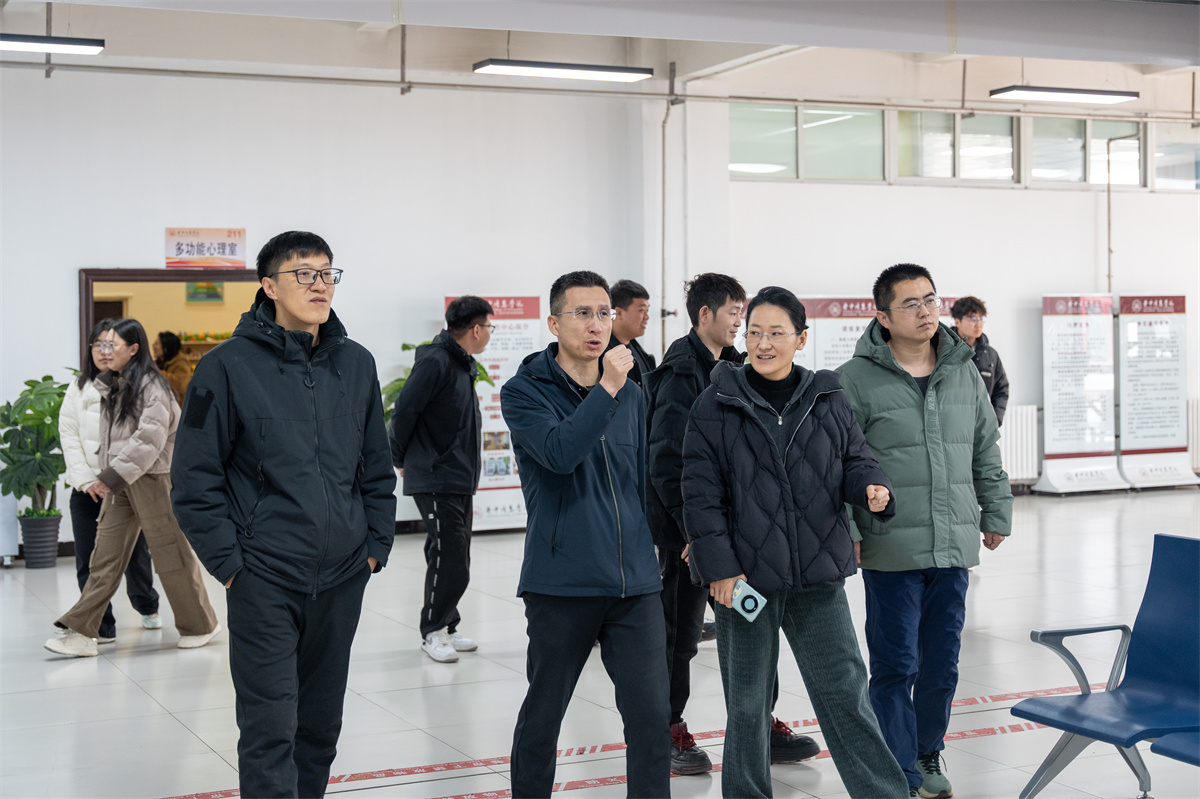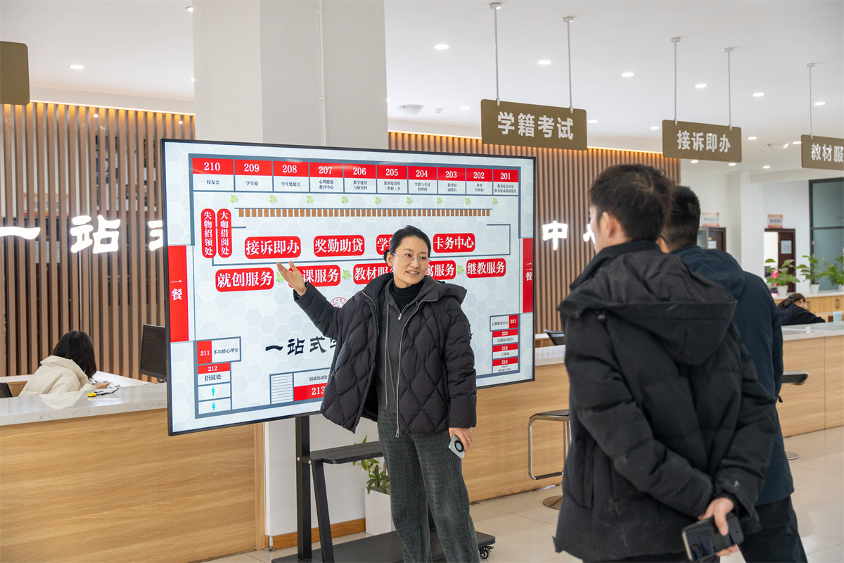 随后,来访嘉宾重点考察了“一站式”学生服务中心。服务大厅整合了学生事务办理、心理咨询、学业指导等多项功能,为学生提供了一站式、全方位的服务,高效的服务模式和精细化管理让嘉宾们感受到了我校在学生服务方面的用心与创新。参观过程中,侯晓娟部长表示,我校在书院社区育人模式上的创新与实践,为学生提供了全方位、多层次的成长空间,值得学习与借鉴。边勇部长也对我校书院社区在硬件投入、空间设施及资源配备建设上的多元性与创新性表示赞赏,并希望未来能够进一步加强校际合作,共同探索高校学生社区建设的新路径。