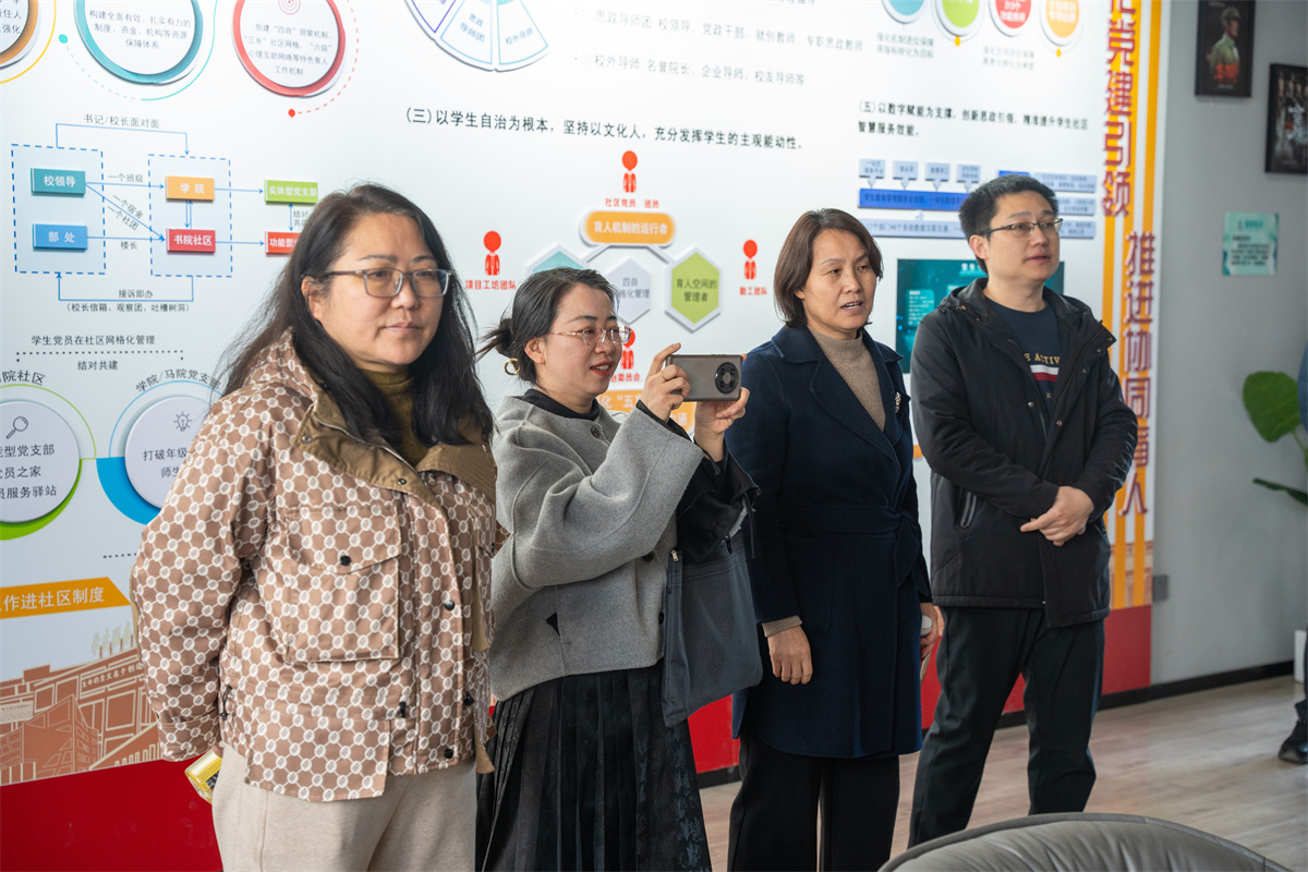 来访嘉宾先后深入参观了我校毣谷书院、上河书院、太行书院、青藤书院社区阵地。通过实地走访、听取介绍、场景观摩等方式,深入了解了我校“一站式”书院社区的建设思路、功能布局、育人模式以及特色亮点。各书院老师详细介绍了书院在党建引领、文化育人、学生领导力培育、综合素质培养、空间育人等方面的经验与成果,展现了我校书院制育人在推动学生全面发展中的重要作用。