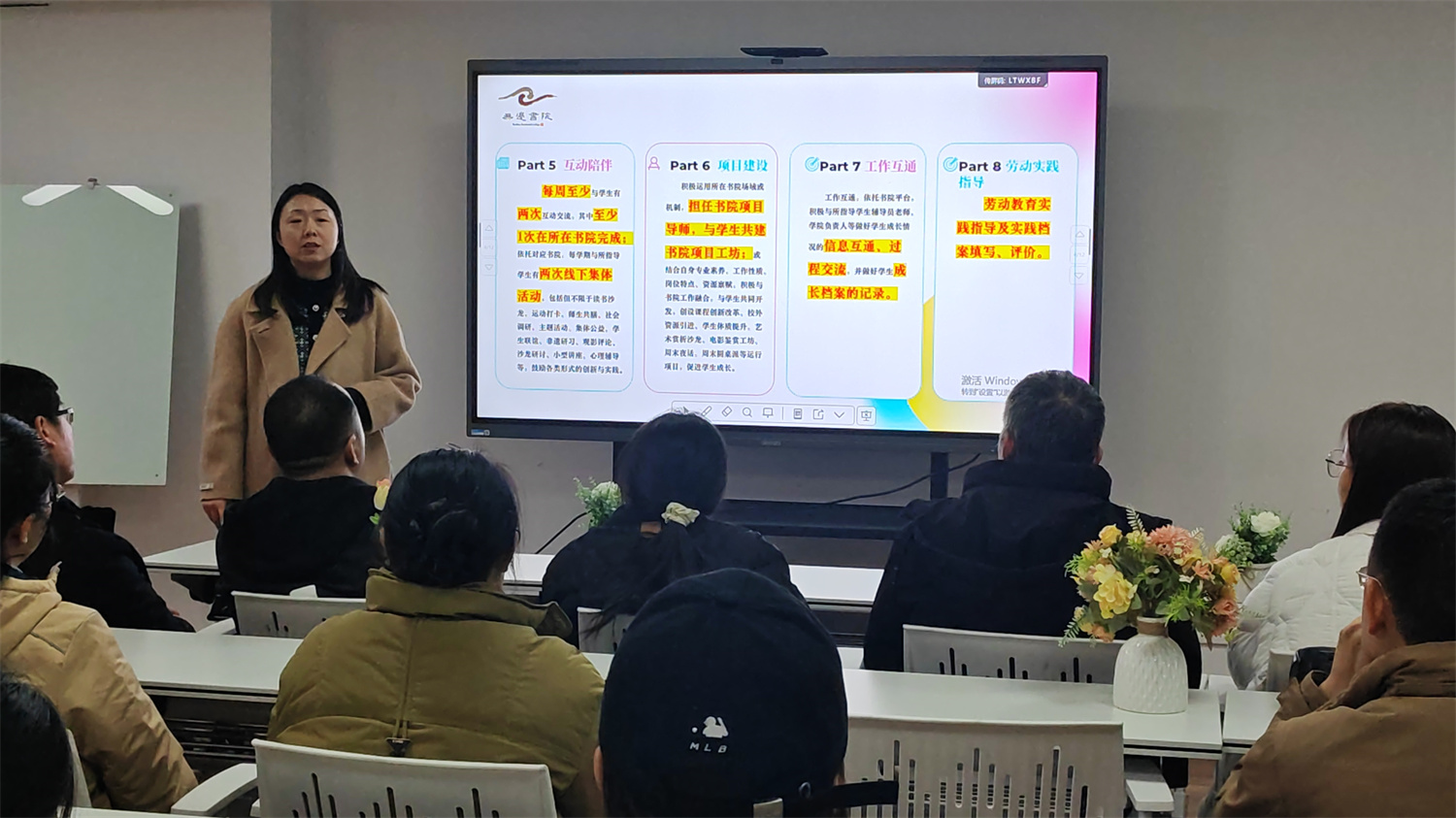 在见面会中,无边书院综合办主任任爱玲老师从育人理念出发,异科导师应积极践行“立德树人”的目标,并鼓励学生参与完满活动。任老师建议,全生异科导师应对学生做到以下几点:进行思想引领、传递先进理念、开展大咖伴读活动,并提供生涯指导,实现双院的协同育人目标。同时,为了进一步提升异科导师工作的规范性和有效性,根据《晋中信息学院全生异科导师工作考核管理办法(试行)》的相关规定,任老师详细就每周互动的次数与具体形式、签到签退的规范流程以及与学生互动交流质量提升等方面,向全体异科导师提供了规范性的指导和具体提示,从而有效推动我校特色育人模式的深入实施与发展。