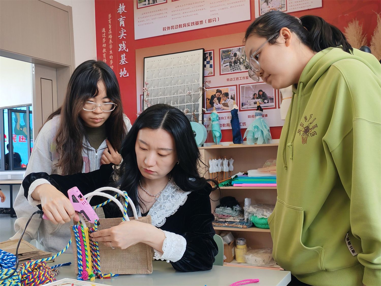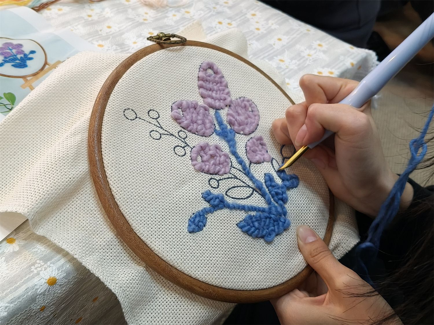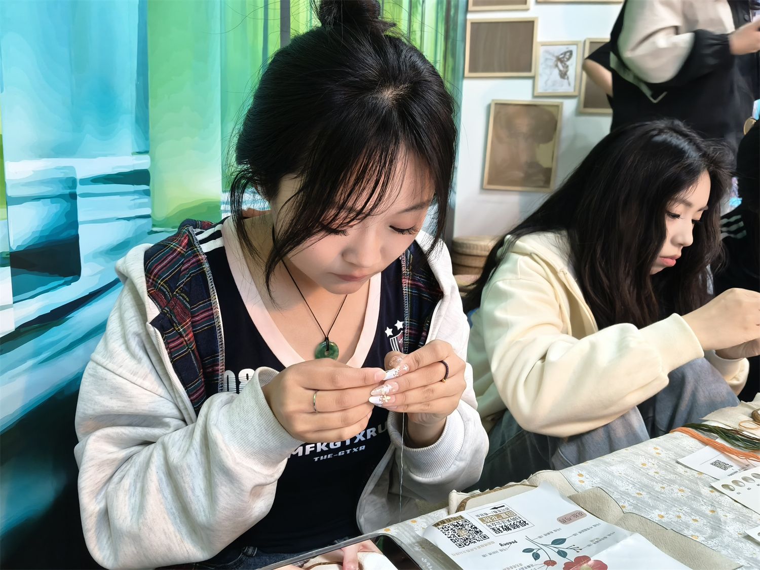 指尖绣艺承古韵,旧物焕新筑雅趣。在“针韵绮梦·指尖绣艺雅集”刺绣教学和“旧物涅槃记”手工课堂上,白燕书院舒菲老师、上河书院吴洪洁老师从基础针法到图案设计,从彩绳编织到麻绳加固,现场演绎指导学生完成作品,同学们在亲身实践中感受传统工艺的魅力。书院社区在以创新开辟传统文化体验区的同时真正打造出集生活服务和文化活动于一体的综合空间。