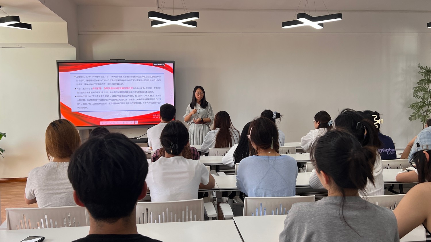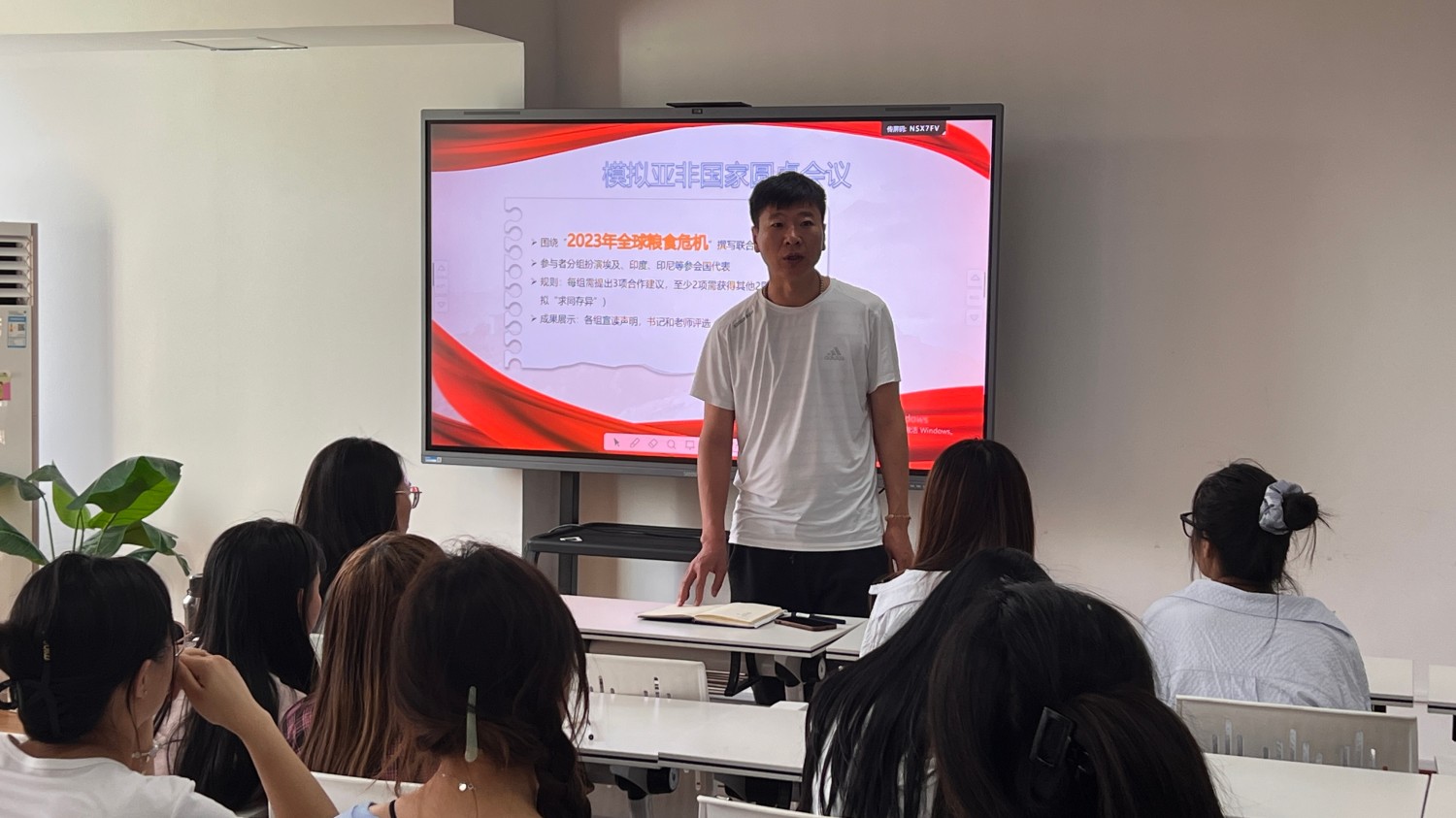 樊云云老师结合近期时政热点——万隆会议70周年,为党员同学们讲述了1955年万隆会议的参会国家以及主要讨论的问题,带领大家学习万隆会议所蕴含的团结、友谊、合作精神。随后,她以万隆会议圆桌讨论所秉持的平等、开放理念为指引,抛出“2023年全球粮食危机”这一话题,组织党员同学们分组并围绕草案展开深入讨论。同学们需站在万隆会议参会国的立场上,结合“求同存异”原则提出3项合作建议,且至少2项需获得其他2国支持。在10分钟的讨论时间里,各小组党员同学积极交流、各抒己见。讨论结束后,每个小组代表宣读本组建议,其他小组同学纷纷举手表决,现场气氛热烈。樊云云老师也针对各小组的建议给出了专业看法,进一步激发了党员同学们的思考。