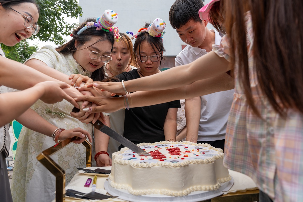 寿星们互相戴上瓜藤编织的生日帽,宛如瓜田星辰。大屏幕播放的生日祝福视频里,老师们的寄语穿越时空而来。随后,劳动教育工作委员会办公室成员、无边书院发展导师雷淼老师、《劳动教育》课程教师胡红霞老师的陪伴下,象征着硕果与甜蜜生日蛋糕推出。寿星代表与嘉宾共同执刀,《生日快乐歌》的旋律中,心愿许下,与劳动相关的成长祈愿悄然生根。