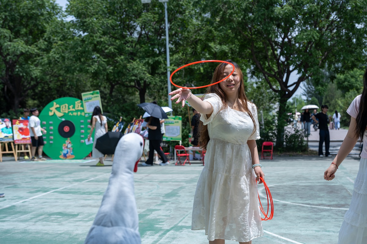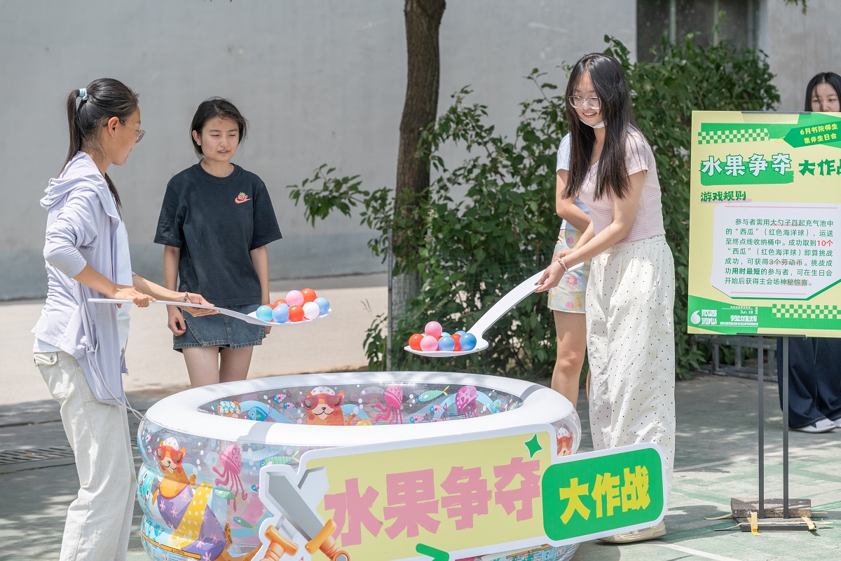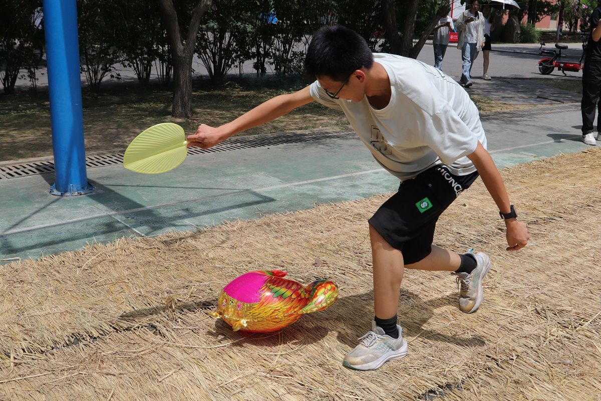 当象征时光的“电视机”开启,寿星们及参与的同学们,踏入精心打造的劳动体验游园会。“赶鸡入笼” 的追逐考验速度与策略;“果蔬连连看”挑战眼力与记忆力;“垃圾分类” 精准投放践行环保理念;“套大鹅”稳准出击展现手眼协调;“职业拼图”快速重构认知劳动形态;“劳动歌曲接龙”的嘹亮歌声让音符传递力量。每完成一项挑战,一枚闪亮的“劳动币”便收入囊中。太行书院的王志超在垃圾分类游戏中深有感触:“反复‘闯关’让我了解了分类标准,这不仅是游戏,更是一堂生动的环保课,提醒我日常主动分类、正确投放垃圾的重要性。”这枚小小的硬币,是汗水的结晶,更是开启主会场惊喜的“金钥匙”。