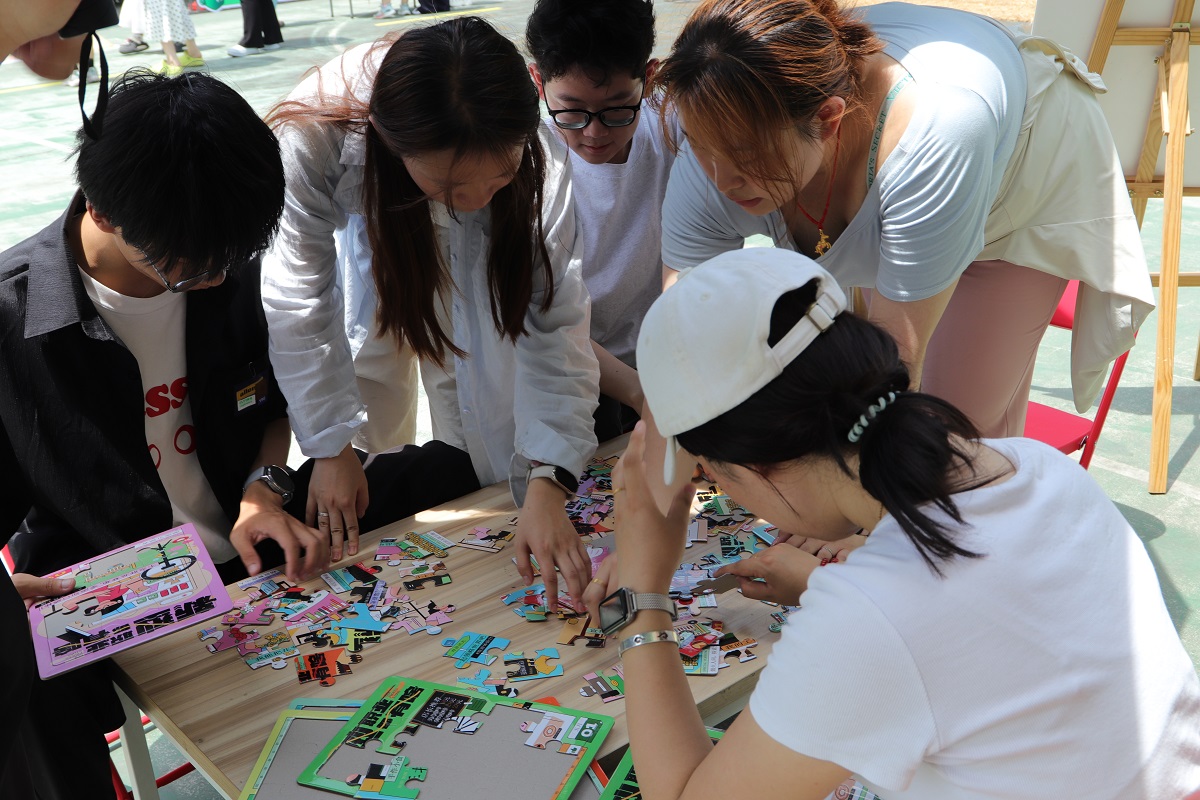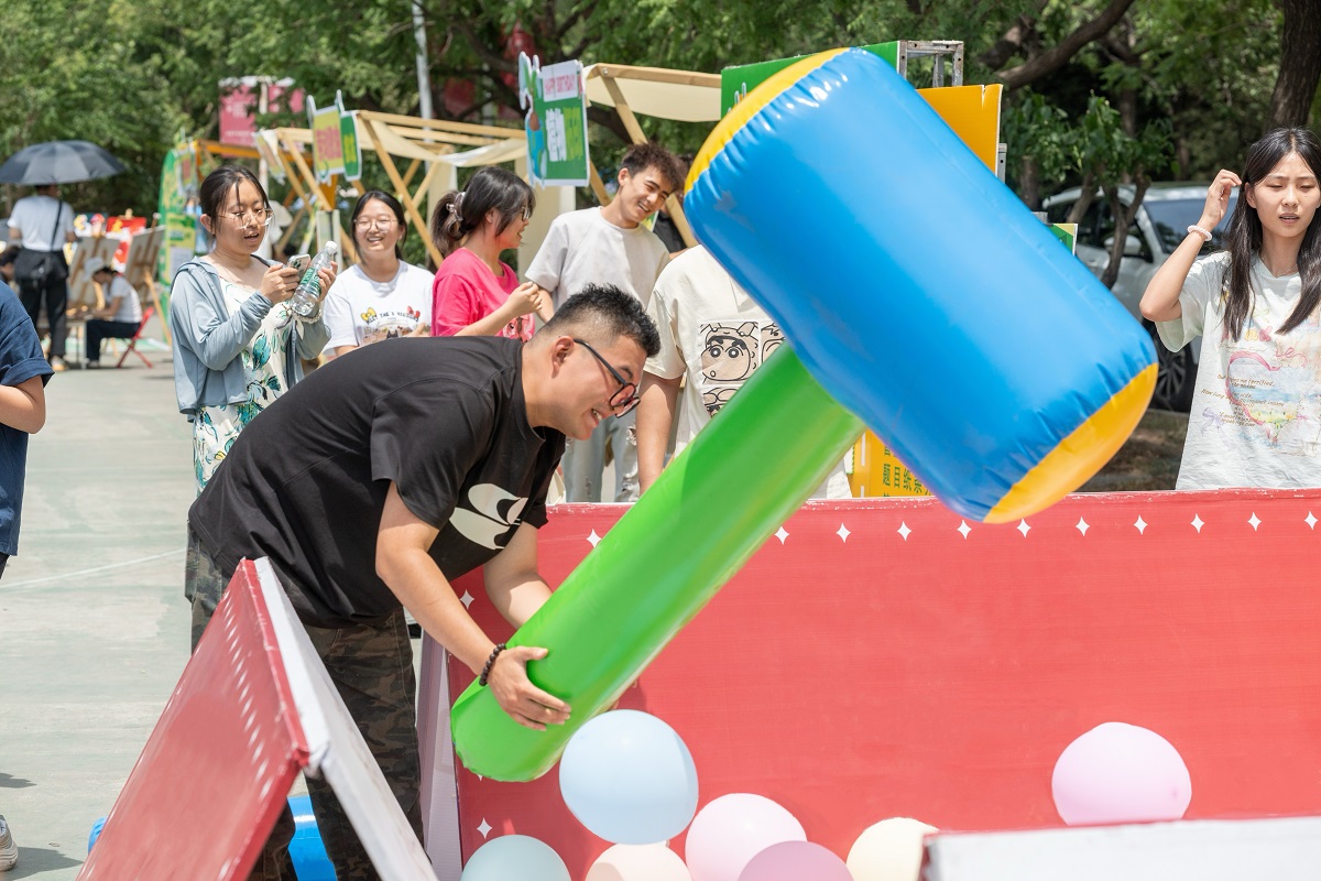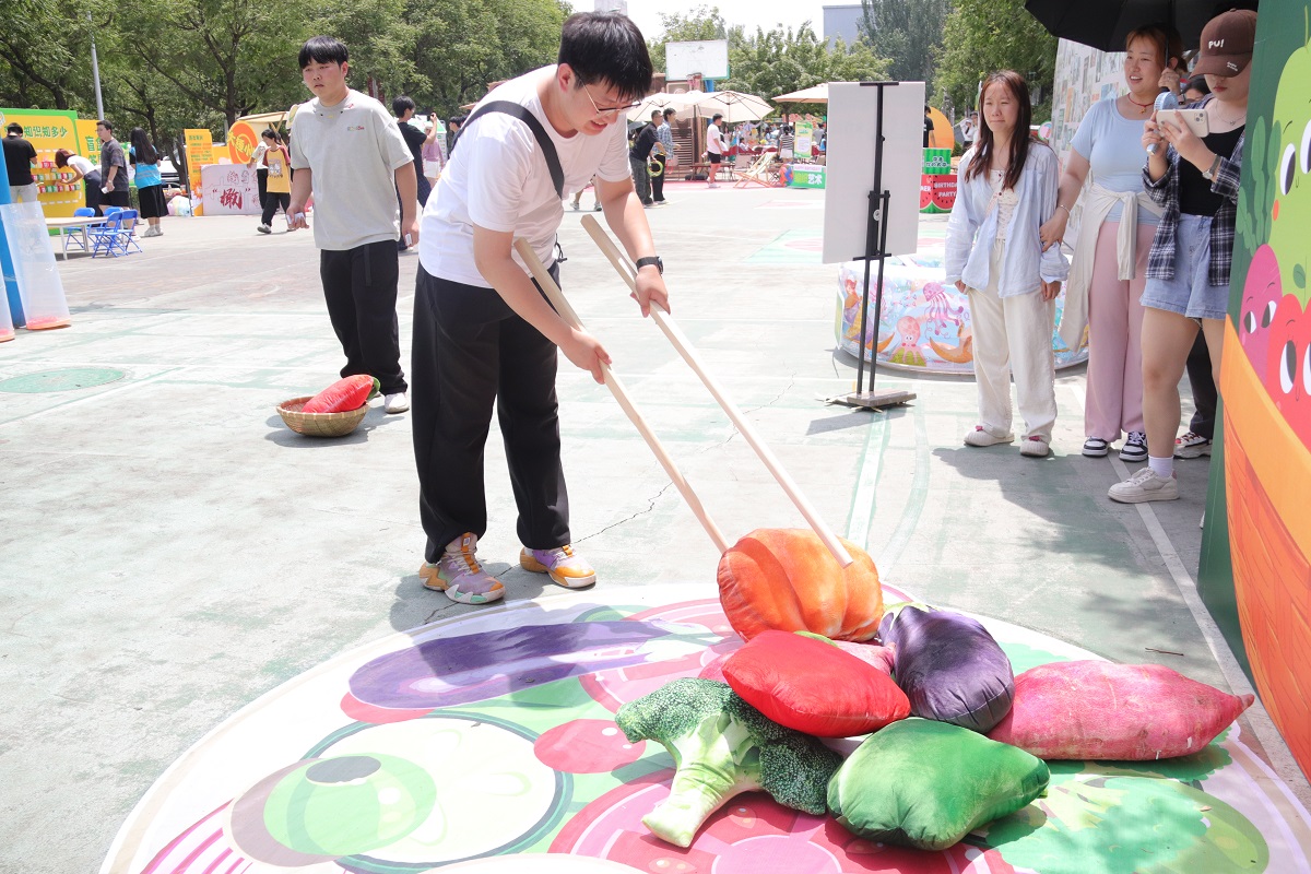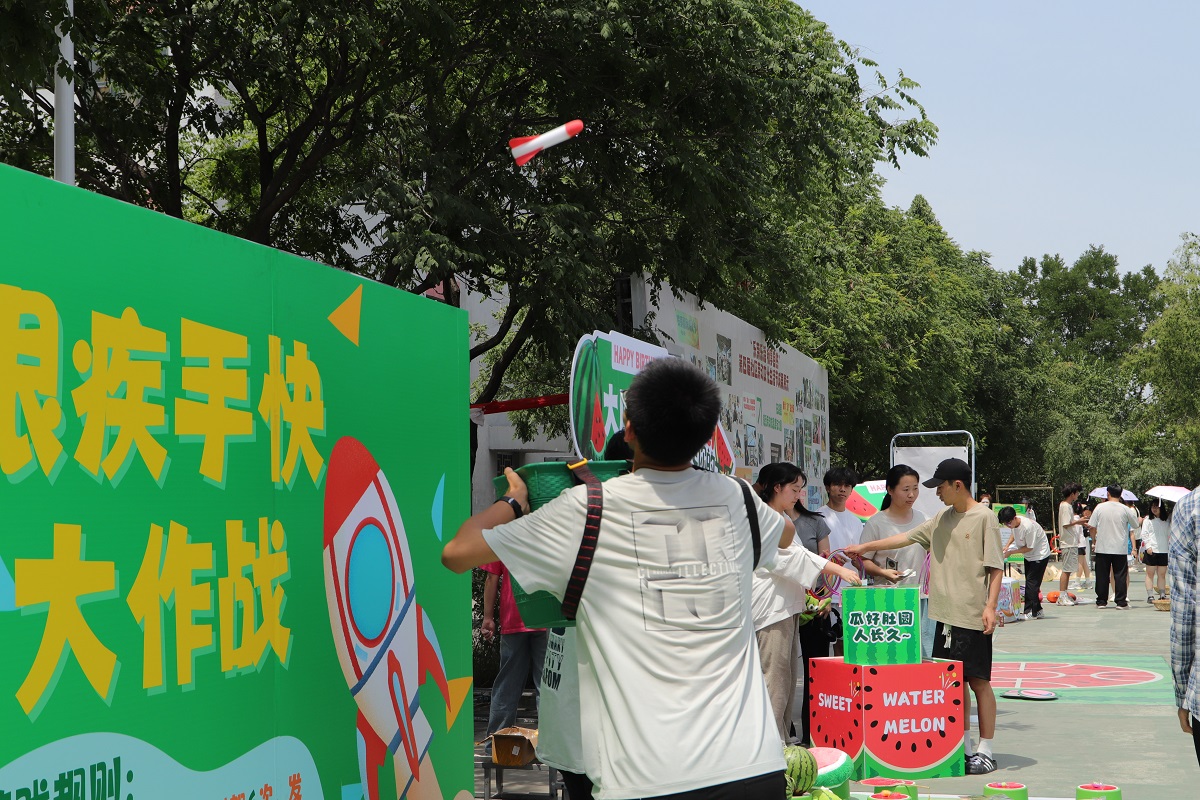 当象征时光的“电视机”开启,寿星们及参与的同学们,踏入精心打造的劳动体验游园会。“赶鸡入笼” 的追逐考验速度与策略;“果蔬连连看”挑战眼力与记忆力;“垃圾分类” 精准投放践行环保理念;“套大鹅”稳准出击展现手眼协调;“职业拼图”快速重构认知劳动形态;“劳动歌曲接龙”的嘹亮歌声让音符传递力量。每完成一项挑战,一枚闪亮的“劳动币”便收入囊中。太行书院的王志超在垃圾分类游戏中深有感触:“反复‘闯关’让我了解了分类标准,这不仅是游戏,更是一堂生动的环保课,提醒我日常主动分类、正确投放垃圾的重要性。”这枚小小的硬币,是汗水的结晶,更是开启主会场惊喜的“金钥匙”。