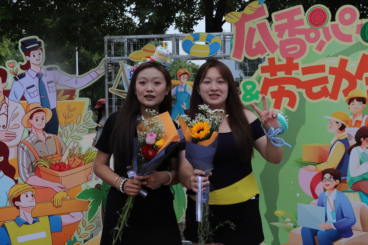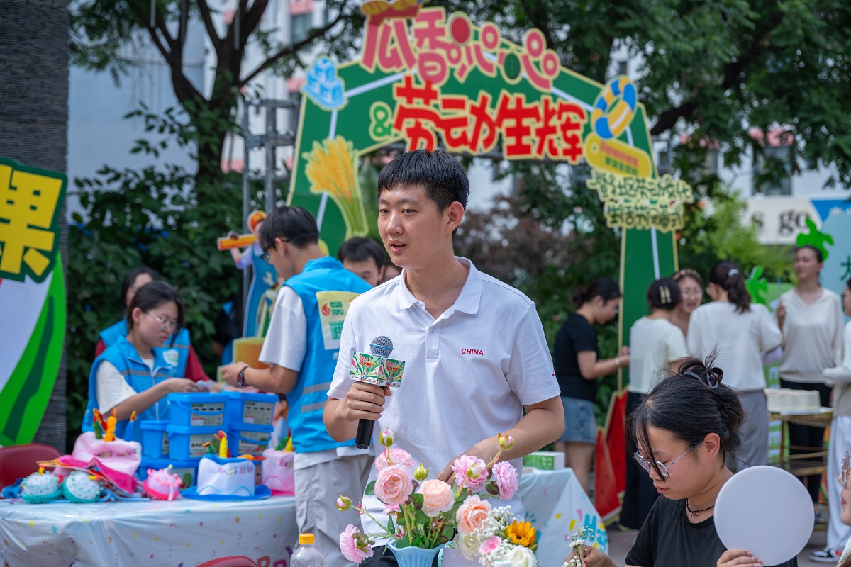 荣光绽放的高潮属于在游园会中脱颖而出的“闯关达人”们。六大项目冠军名单揭晓,书院为他们颁发定制奖品,掌声致敬这些在趣味劳动中闪耀的“星辰”。匠心对话聚焦平凡岗位的不凡光芒,杏花书院发展导师于叶璠老师主持访谈,保安李班长、食堂陈师傅、宿管罗阿姨分享了日常坚守的点滴。学生代表们将饱含敬意与夏日气息的水果花束献给三位工勤老师及所有默默付出的校园守护者,感谢他们日复一日创造整洁、安全、便利的环境,“你们辛苦了!”温暖全场。
