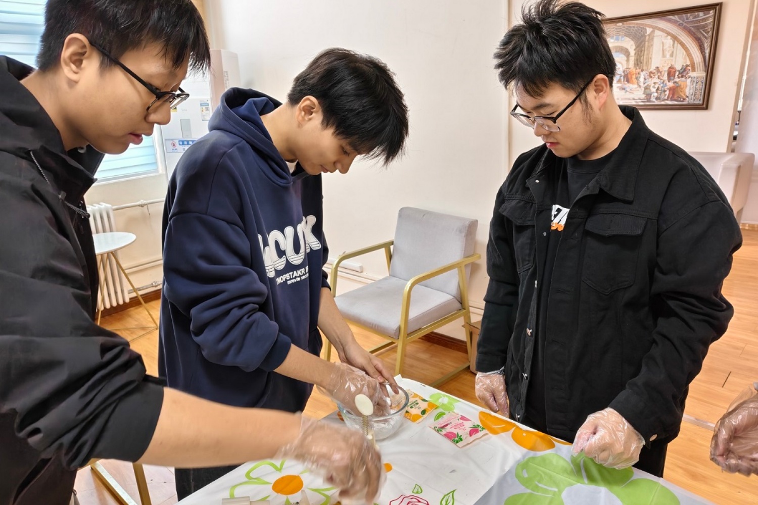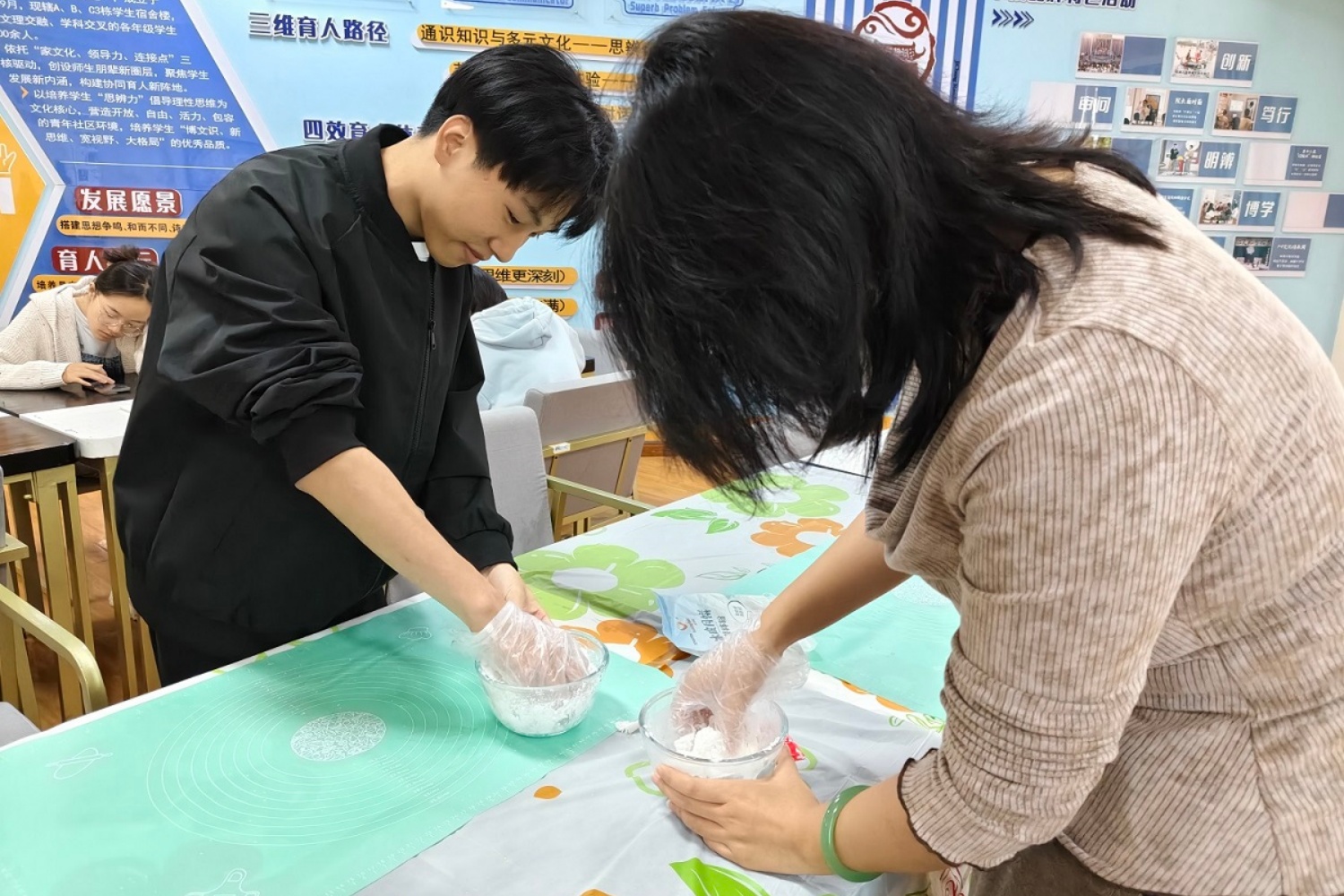“揉面有三光,面光、盆光、手光。”聂老师穿梭在学生中间,不停地叮嘱同学们制作月饼第一步就是要把糯米粉里倒上适量热水,把面粉揉成光滑不粘手的面团。可是,这看起来简单的第一步,差点就让两位男同学当场放弃。从没下过厨房的他们,刚开始还信心满满,但随着一会加面,一会倒水的情况屡次出现,两位男生直呼这到底该怎么把握面粉和水的比例啊!案板上的面团愈发 “不听话”,再瞥见邻组同学的面团早已揉得圆润光滑,两人急得直挠头。“别着急,也别再加水了,就慢慢揉,用你手腕的力量去推整个面团,不停地揉搓就可以了,当面团大概成型的时候,就要把碗边黏着的小面团还有手上的小面团也一起揉进去,这样揉出来的面才算成功。”看着犯难的两位男同学,聂老师走到他们身边耐心指导。在老师的鼓励下,两位同学放平心态,一点点揉搓,慢慢感受到原本 “叛逆” 的面粉终于听话,而后聚成了光滑的面团。这小小的面团仿佛藏着人生的道理:唯有耐住性子、反复打磨,才能揉出 “成型” 的精彩。