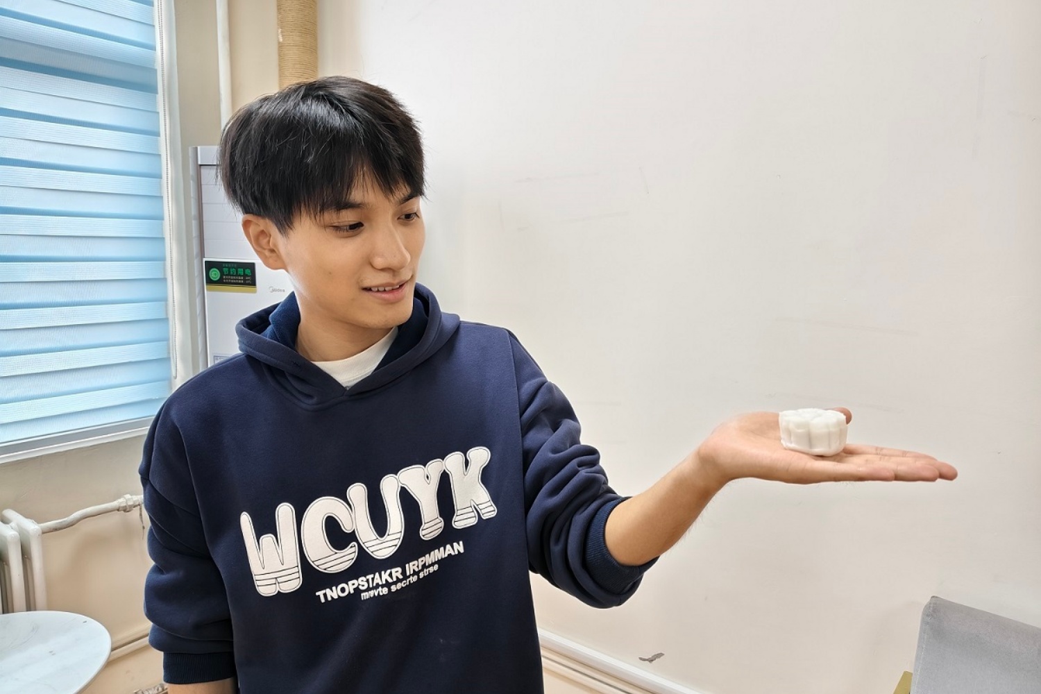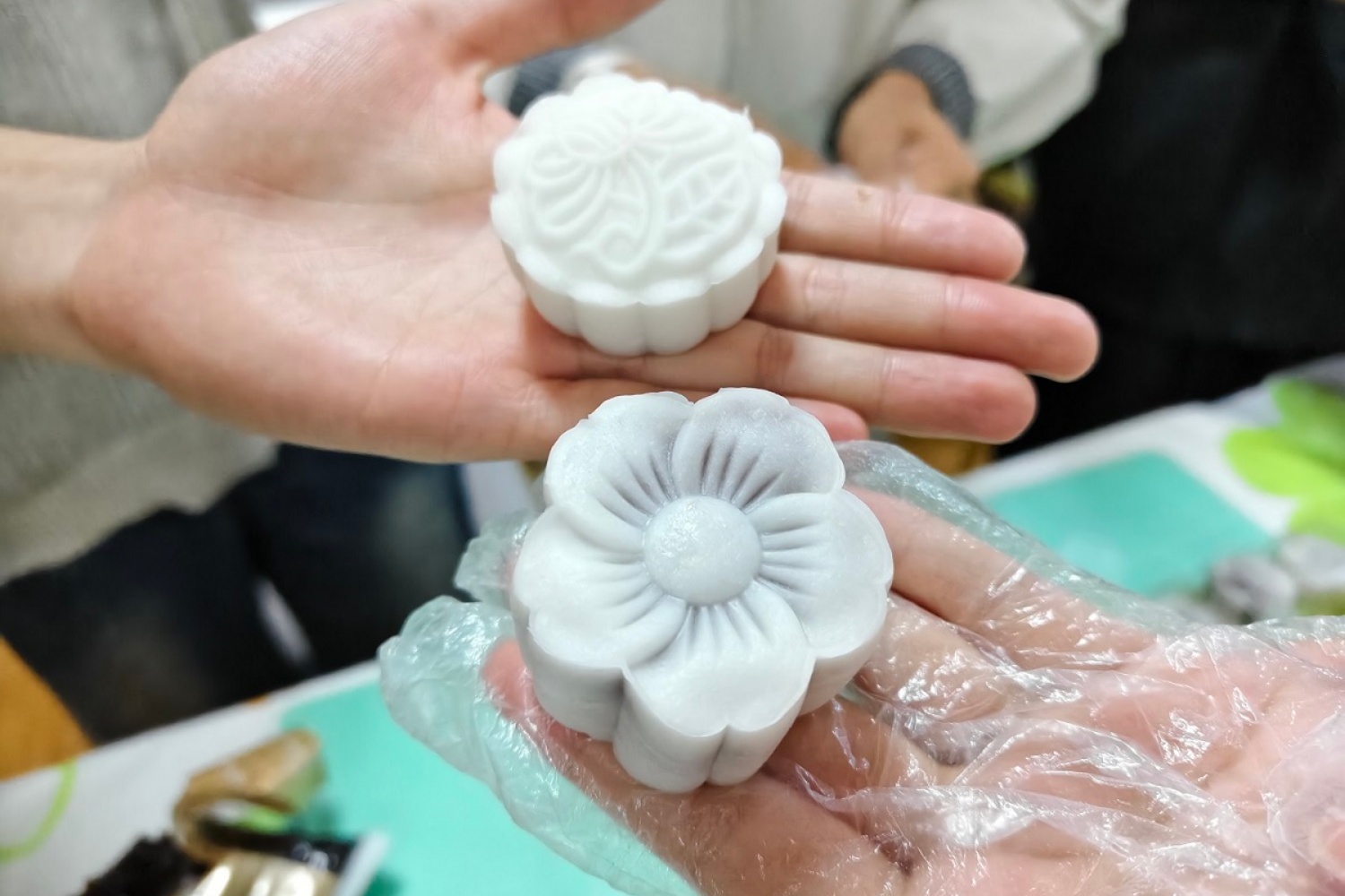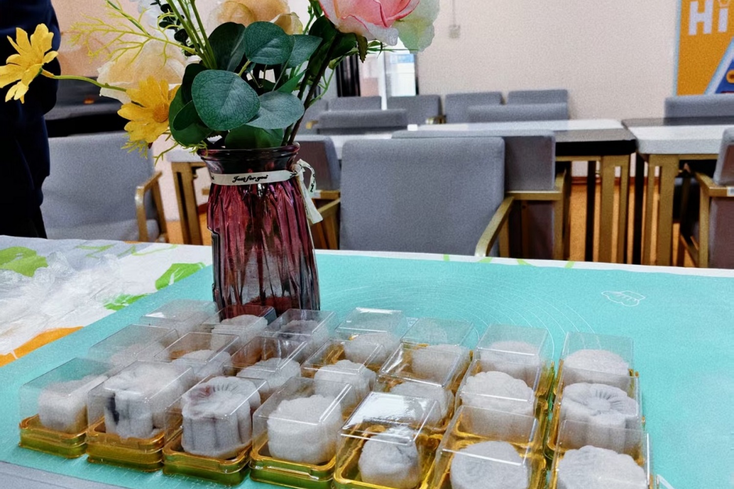 最令人期待,莫过于压模环节。同学们将揉好的月饼坯放入带有花纹的模具中,轻轻按压后再慢慢取出,一个个造型精致、花纹清晰的冰皮月饼便诞生了,从模具中轻轻推出的一刹那,也瞬间点燃了同学们的热情。“哇,我的月饼上有花朵图案!”“我的月饼太满了,都要塞不进去了!”“我觉得冰皮薄点,微微透出来馅料的颜色,太好看了!” 大家兴奋地展示着自己的作品,脸上洋溢着自豪与喜悦的笑容。经过近一个小时的忙碌,同学们纷纷完成了自己的“作品”。有的同学将制作好的月饼装进精美的包装盒,打算带回家与朋友分享;有的则忍不住当场品尝起来,“自己做的月饼就是不一样,软糯香甜,太好吃了!”马英斌同学一边吃着月饼,一边开心地说,满足的神情感染了在场的每一个人。