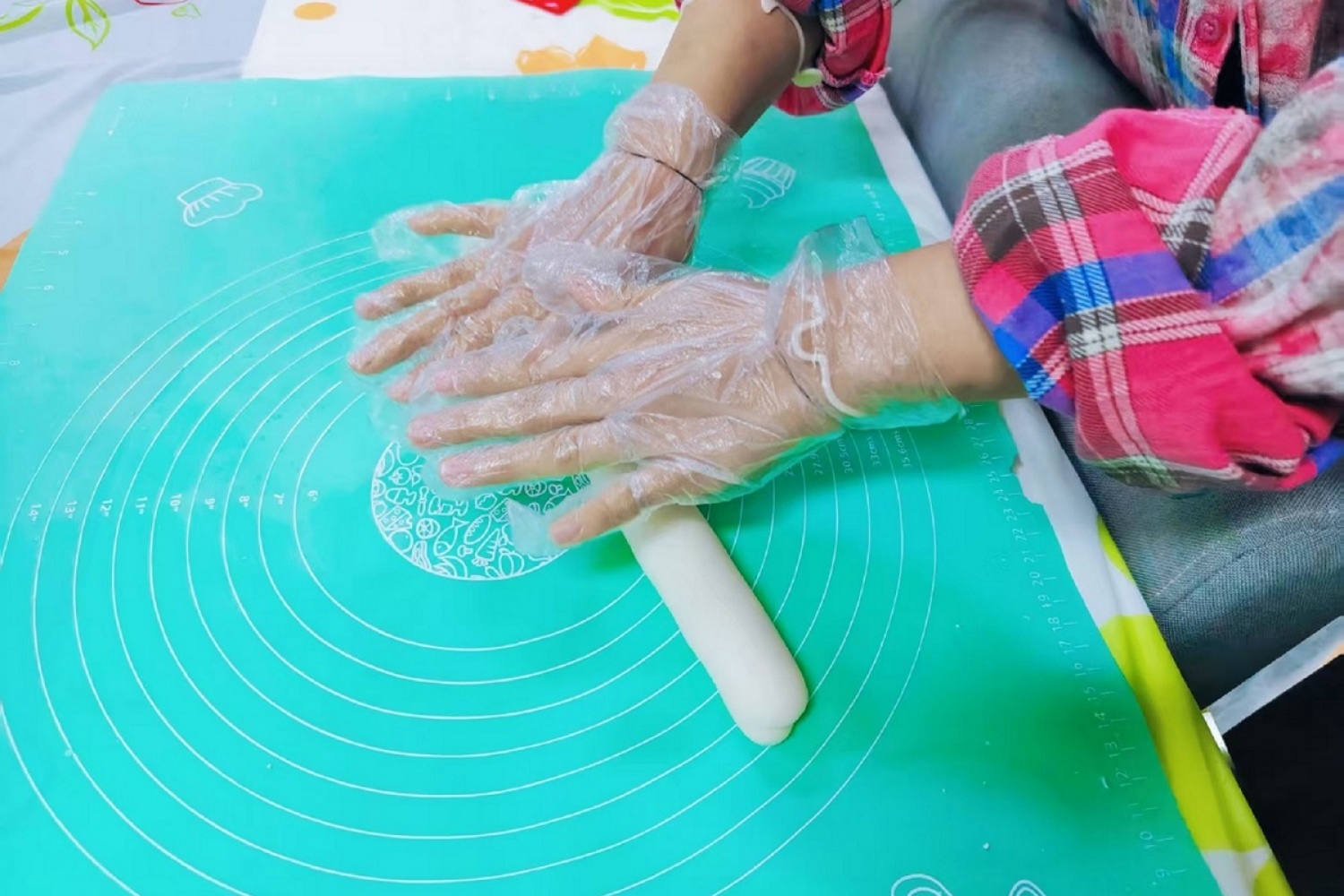 面团就绪,接下来便是 “塑形” 的乐趣。成型的面团,还需要搓成长条后,再拆成一个一个的小剂子,十个指头灵活配合下,变成一个圆形的饼皮,豆沙馅的绵密、芋泥馅的香甜,全看同学们个人喜好往里加。同学们小心翼翼地将馅料包进冰皮里,生怕力道太大会撑破饼皮,也怕力气太小裹不住满心的期待。一个个圆润的月饼坯在掌心逐渐成形,承载着同学们对中秋的美好想象。