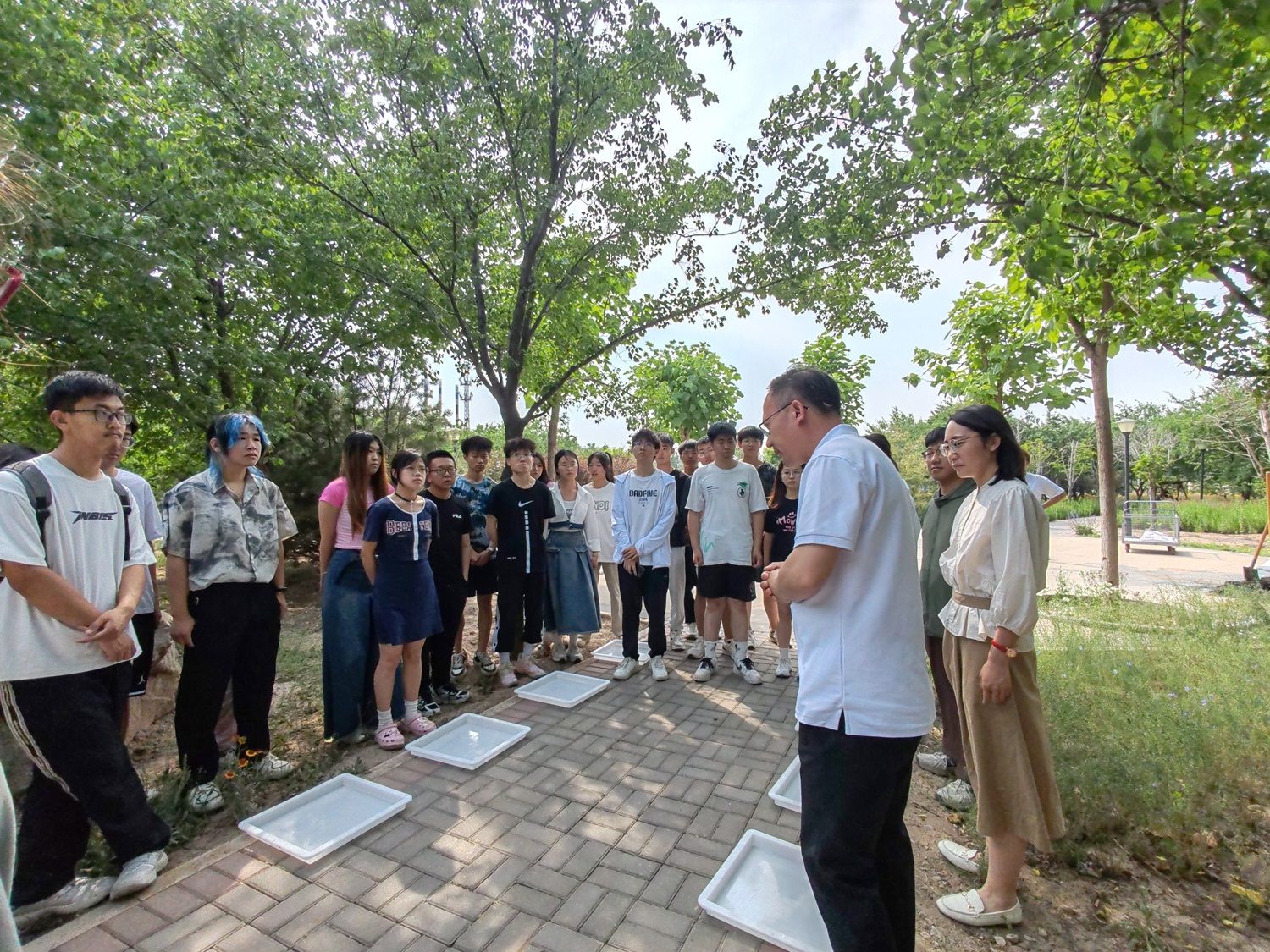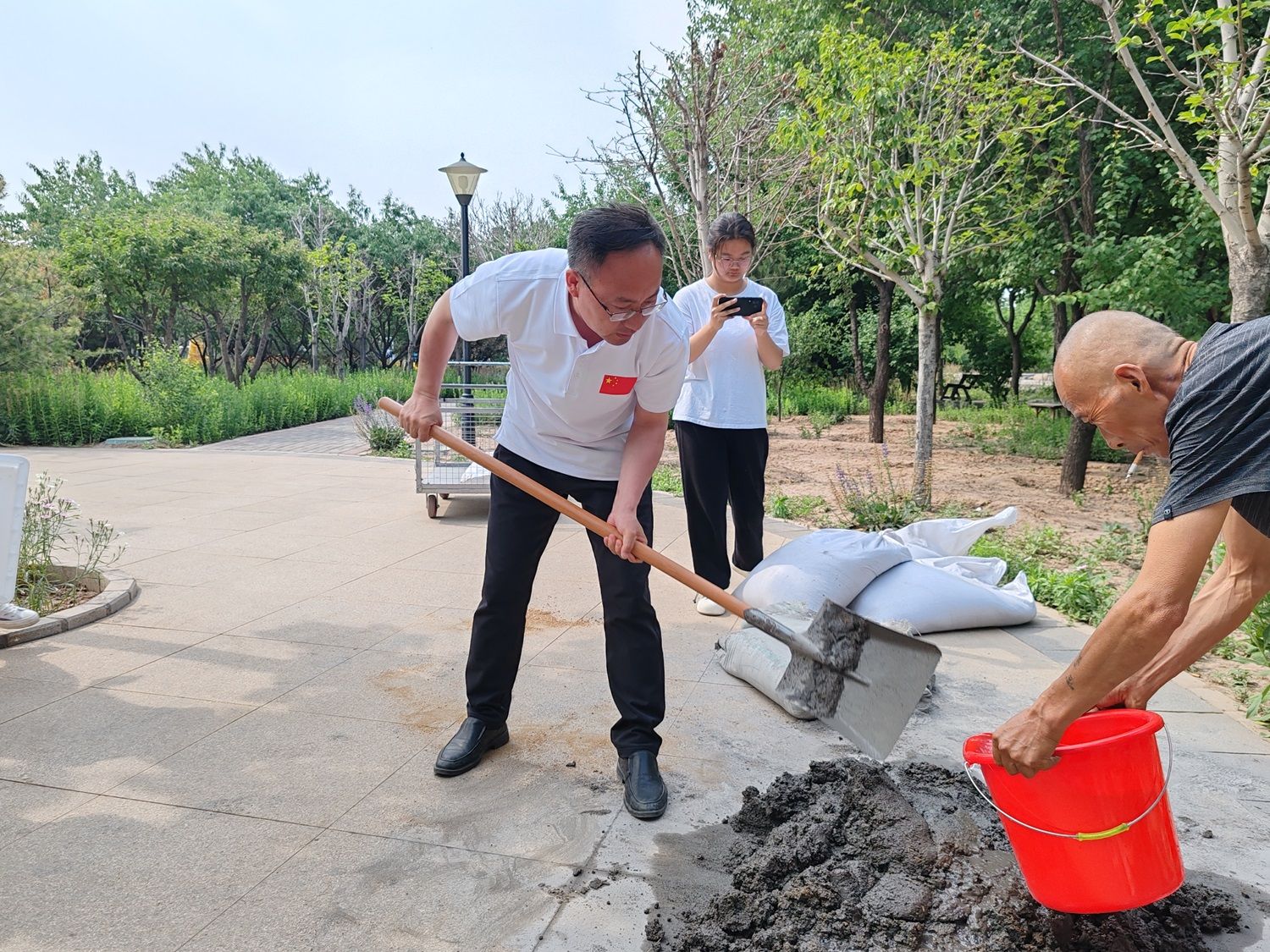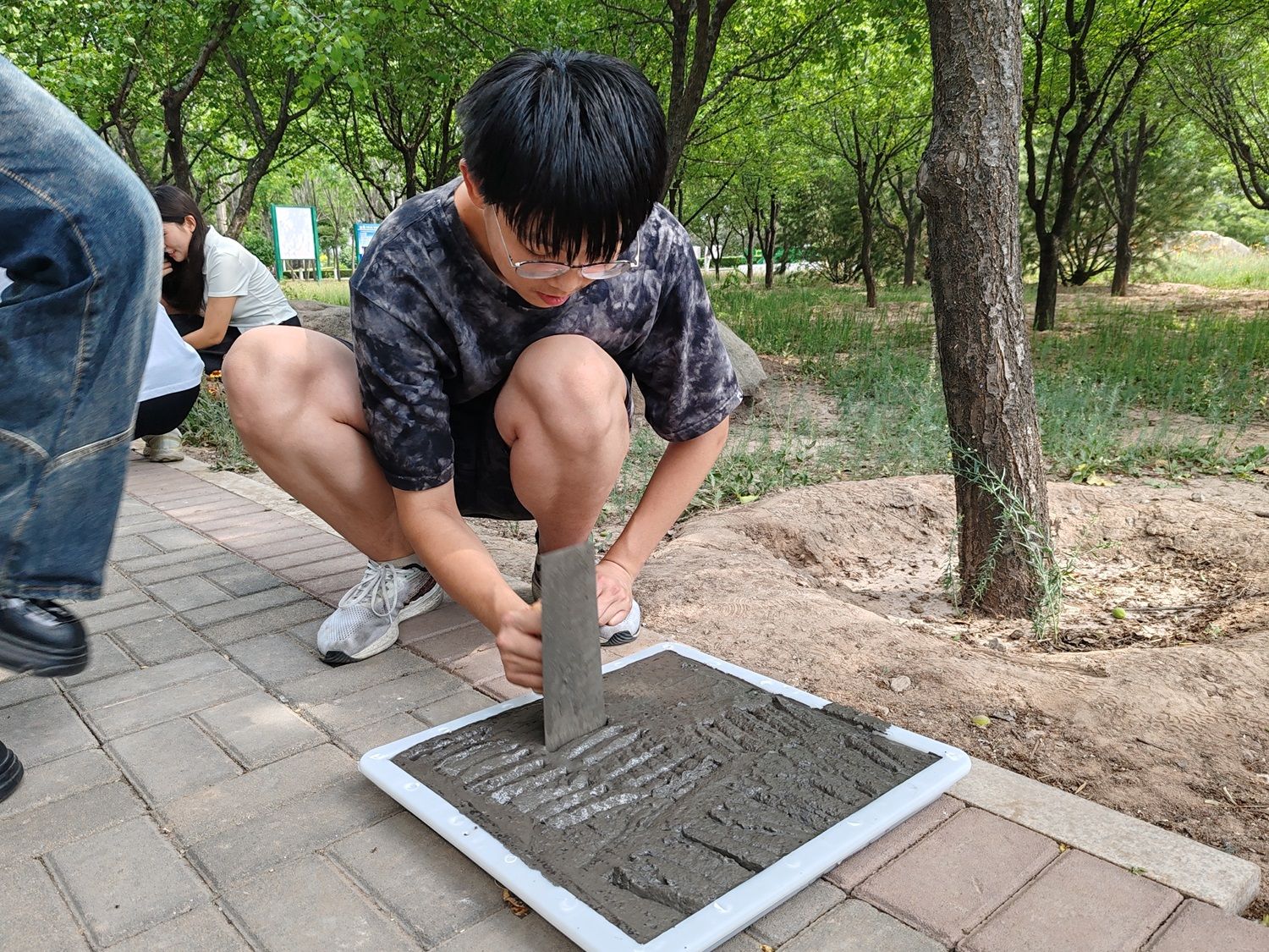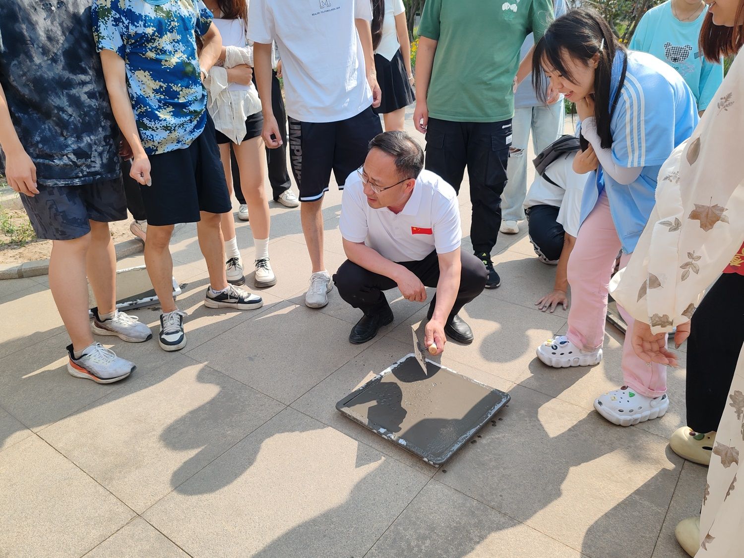 家宴结束后,院长带领大家来到太行湖畔,开展“太行故事写真·劳动擦亮青春底色”为主题的劳动实践活动。名誉院长亲自指导大家为太行湖畔的泥泞小道上制作脚踏石。从和水泥、注泥浆、填模具到4个小时以后得脱模刻字,院长亲力亲为耐心教授同学们去体验和感受一名泥瓦工的工作。脚踏石制作的过程中,院长鼓励大家以小组为单位共同商量在脚踏石上留下最有价值和意义的一个字,并给大家讲述亲手制作校园景观给学校留下刻有自己名字和信息的价值和意义。院长指出,这些脚踏石未来会是一段有历史文化沉淀的载体,一百年后会或许会成为我们留在学校的文物,是我们每一个人经历此刻的见证。脚踏石的制作和姓名信息的书写让学生们收益匪浅,大家不仅感受到劳动的魅力和劳动精神,更是一次心与心的交流,打开了大家的内心,是寻找自我定义和自我价值的勇敢之旅。