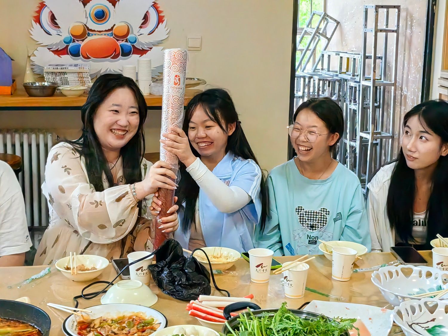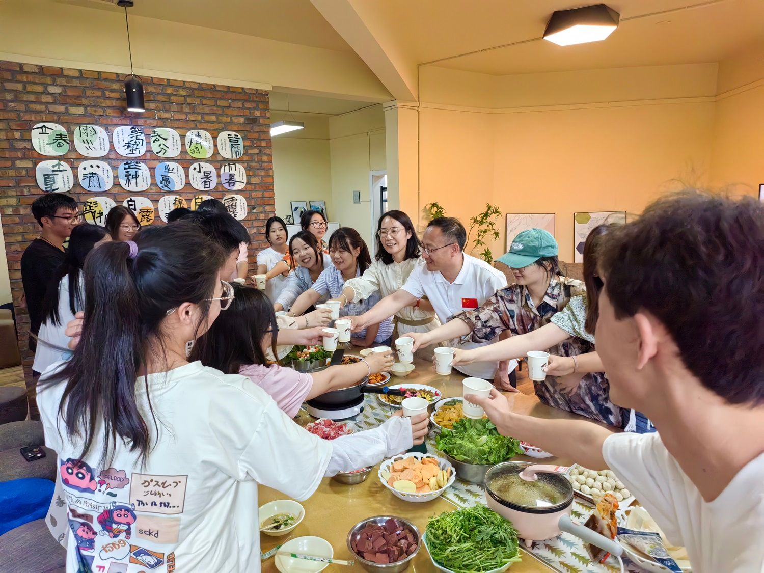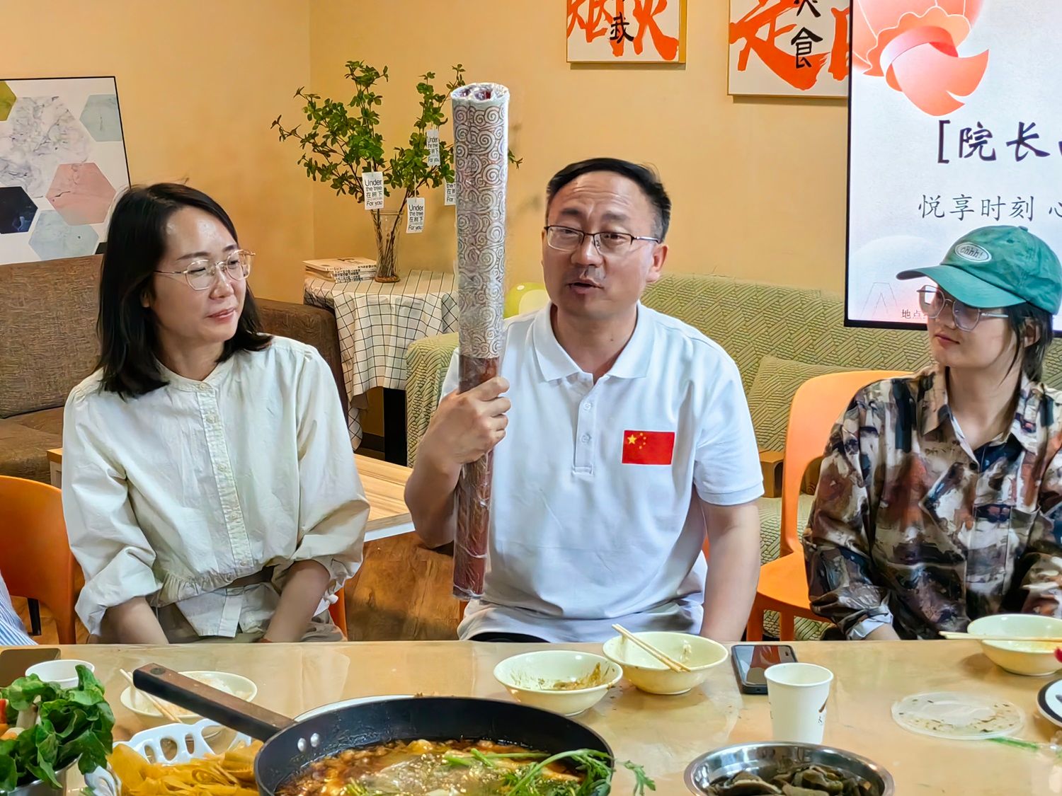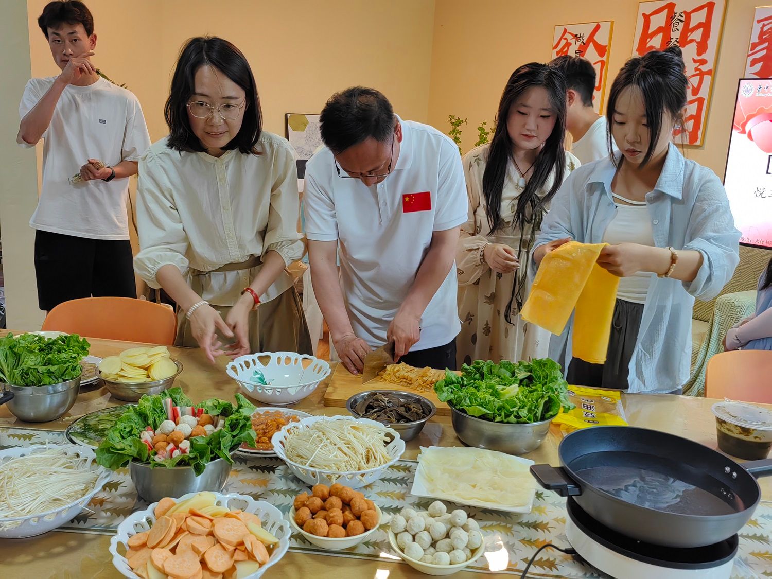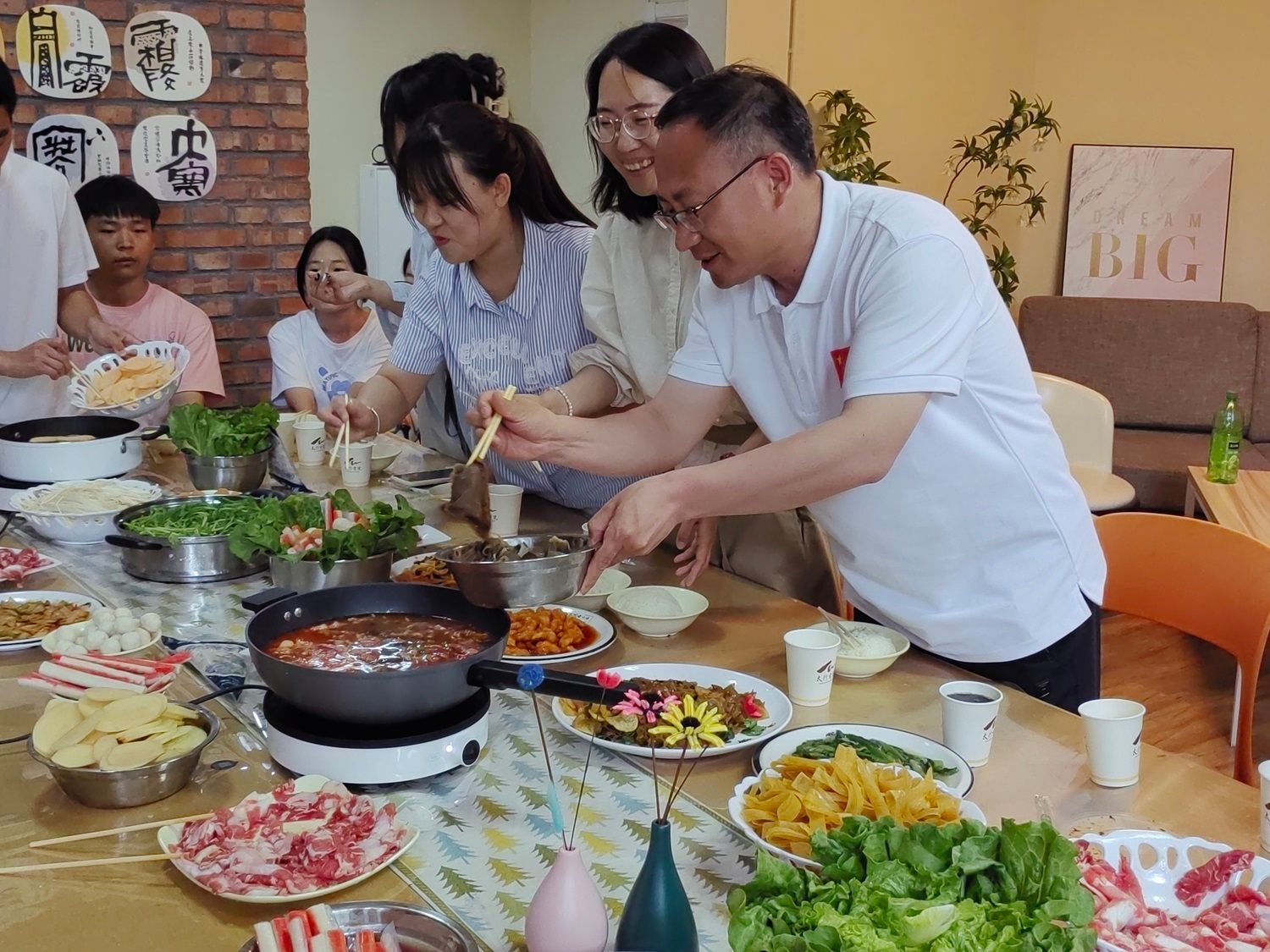 中午12:00,太行书院名誉院长薛保红教授与太行书院综合办公室教师团队和书院学生会代表在健康时尚生活馆“共烹佳肴,同享美食”。 师生团队倾力共同筹备家宴,沸腾的火锅浸润着与院长共度的温情而又浓烈的时光,大家各司其职,娴熟的刀工,默契的配合,在有说有笑中一道道美食便端上桌台。师生围桌而坐,当一道道菜品滑入浓郁鲜美的火锅汤中,烟火气扑面而来。院长与书院学生亲切交流,询问他们的姓名和家乡,他们的学习生活情况,毕业打算,给与关心指导。院长给大家分享了他作为2008年奥运火炬手的高光时刻,并鼓励大家每个人都要勇敢的去追求属于自己的人生高光时刻,结合本次共膳家宴的主题,院长提出科学饮食与粮食安全等问题,引起了在场师生的关注。他们纷纷表示,要在日常生活中践行这些理念,为构建健康中国贡献力量。名誉院长他强调,食品安全是关乎国计民生的大事,师生们要增强食品安全意识,严防“病从口入”。名誉院长的讲话让书院师生受益匪浅,他们将把这些理念融入到日常生活中,践行科学饮食、安全饮食、健康饮食,为构建健康中国、保障粮食安全贡献自己的一份力量。