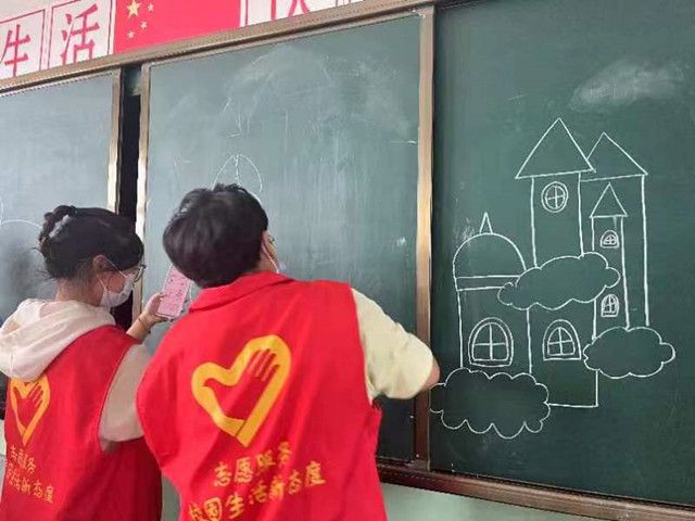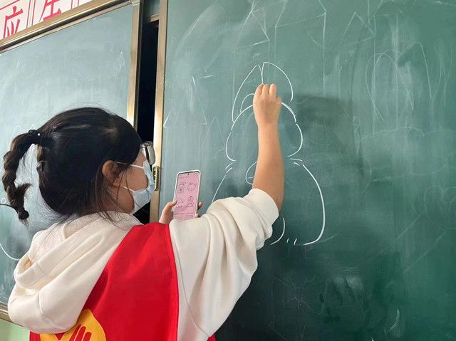“我们一起来画出小兔子和大月饼”志愿服务队副队长霍晓涛在黑板上一笔一划勾勒着一只小兔子的形象,舒菲老师及其他成员带着孩子们临摹着黑板上的图案,和大家一同完成着一份献给中秋和自己的心意,跃然纸上的各色小兔子,展现出的不仅有五彩的中秋,还有缤纷的童年。