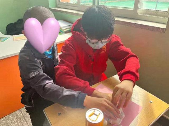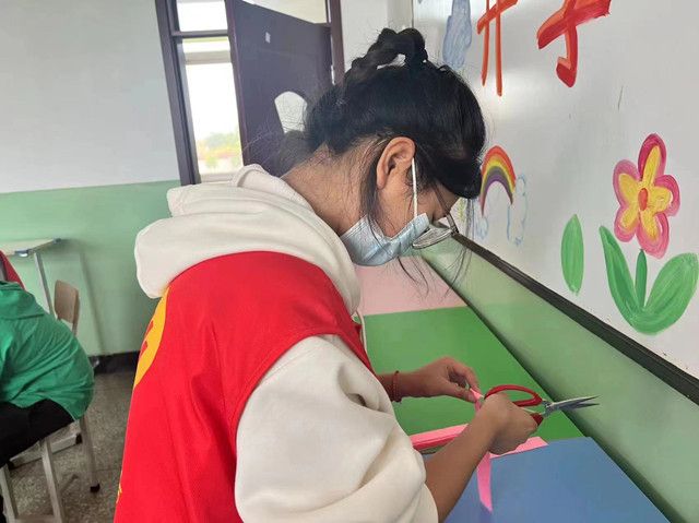 一扭一扭,再一插,一朵永不凋谢的花朵绽放在志愿服务队队长王邦手中,在孩子们的眼睛里,“这样,再往这边扭一扭,就好啦”成员郎宜杰手把手教着小女孩,稚嫩的将五根粉色绒棒弯曲,裁剪,编制……