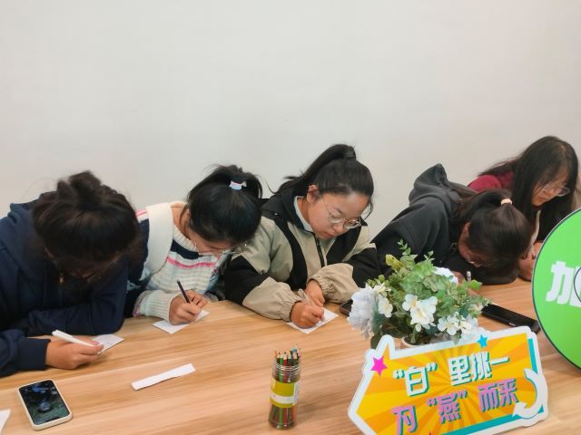游戏进入最后的环节:连句成段。新闻编辑部副部长刘菀茹先给同学们详细介绍了游戏规则,即每组抽出一个主题,每组成员分别写出与之相关的两句话,最后小组成员内部围绕该主题连成一段文字。游戏看似简单,但也很有挑战性,大家认真思考,动笔写下贴合自己主题的文字。游戏进入尾声,全蕊同学分享了其中两组作品,众人连连叫好。在这次活动中,同学们通过有趣的小游戏更深入地理解新闻工作。给同学们提供一个放松心情,增进友谊的机会,同时体验新闻编辑部的特色文化。