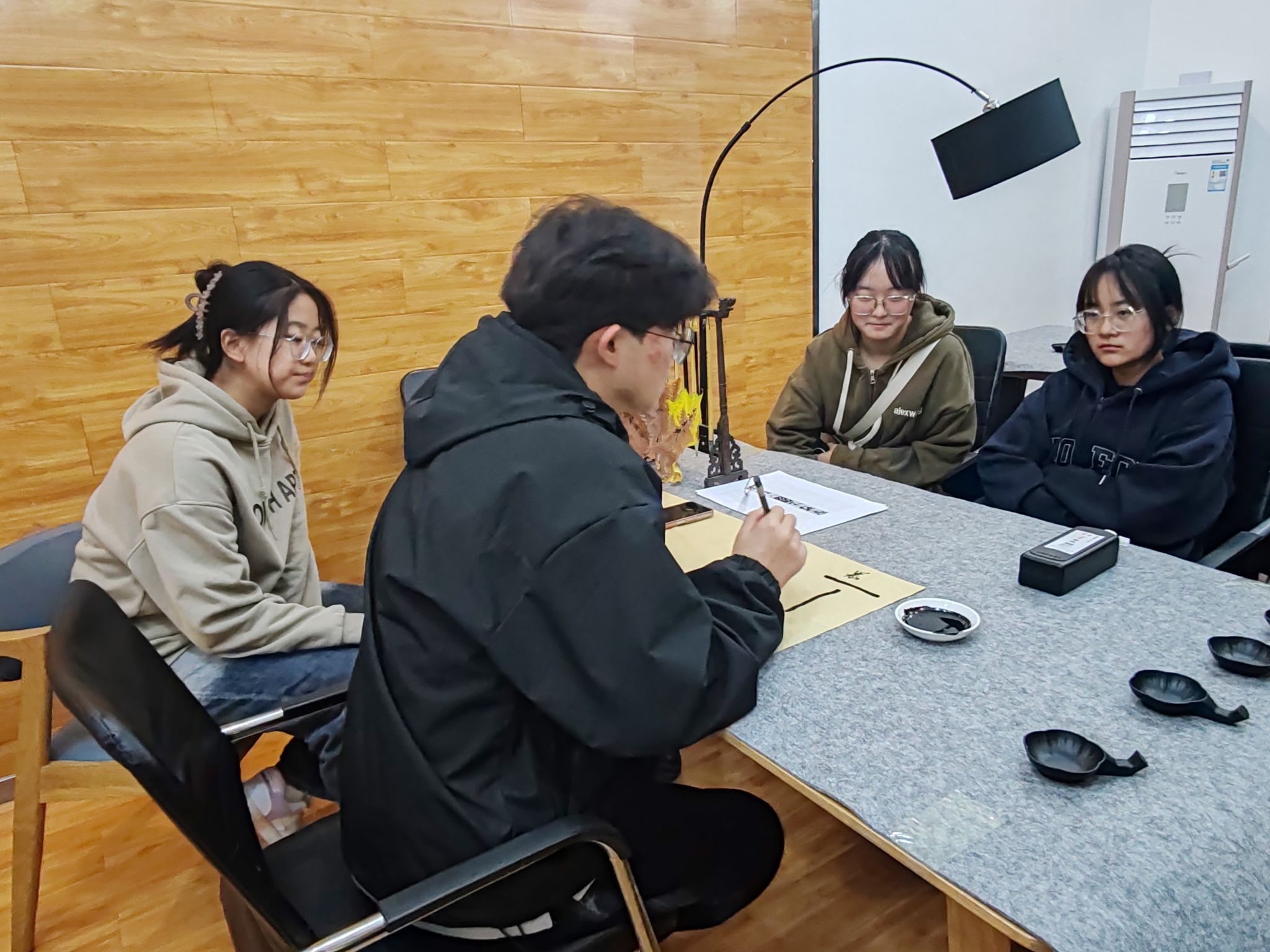活动开始之前场地服务部部长郎宜杰用自己写的书法作品将林间书屋进行装扮。整个场地布置得既简洁又优雅,既体现了书法的文化内涵,又展现了活动的品质和品味。墙壁上挂着的“读书破万卷,下笔如有神”“平安喜乐”为整个空间增添了一丝文化的气息。进入房间满墙的书法作品与萦绕满室的悠韵墨香,让同学们被一种宁静致远的氛围所包围,仿佛走入了一个独立于外界喧嚣的世界。