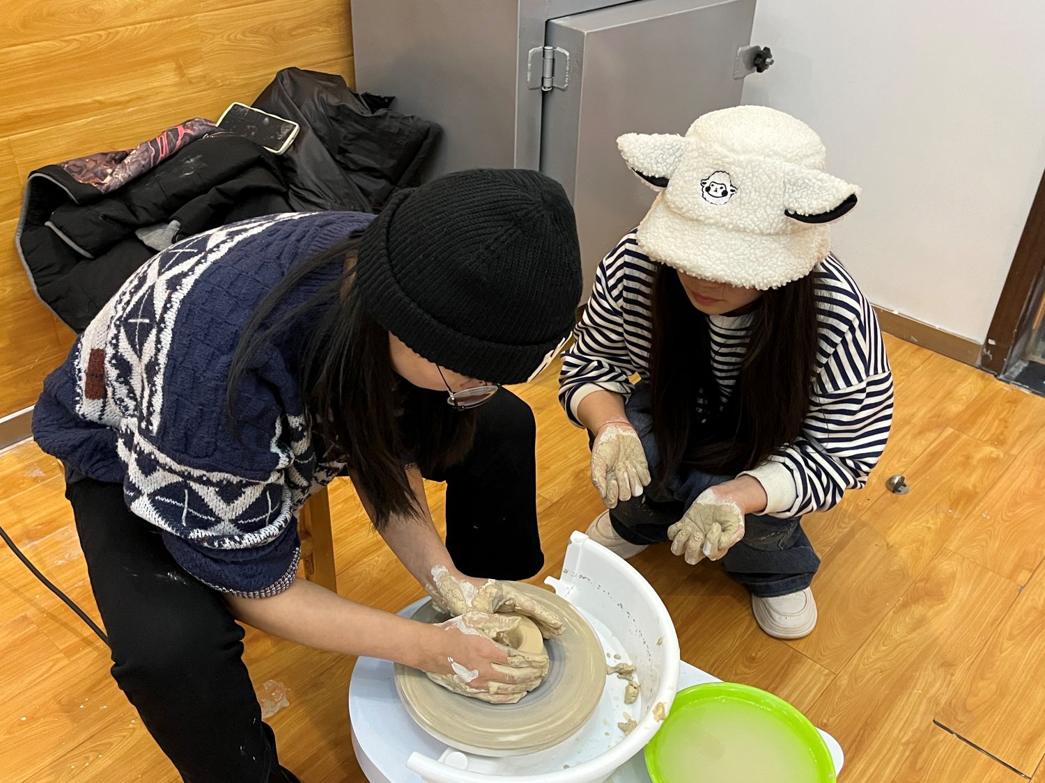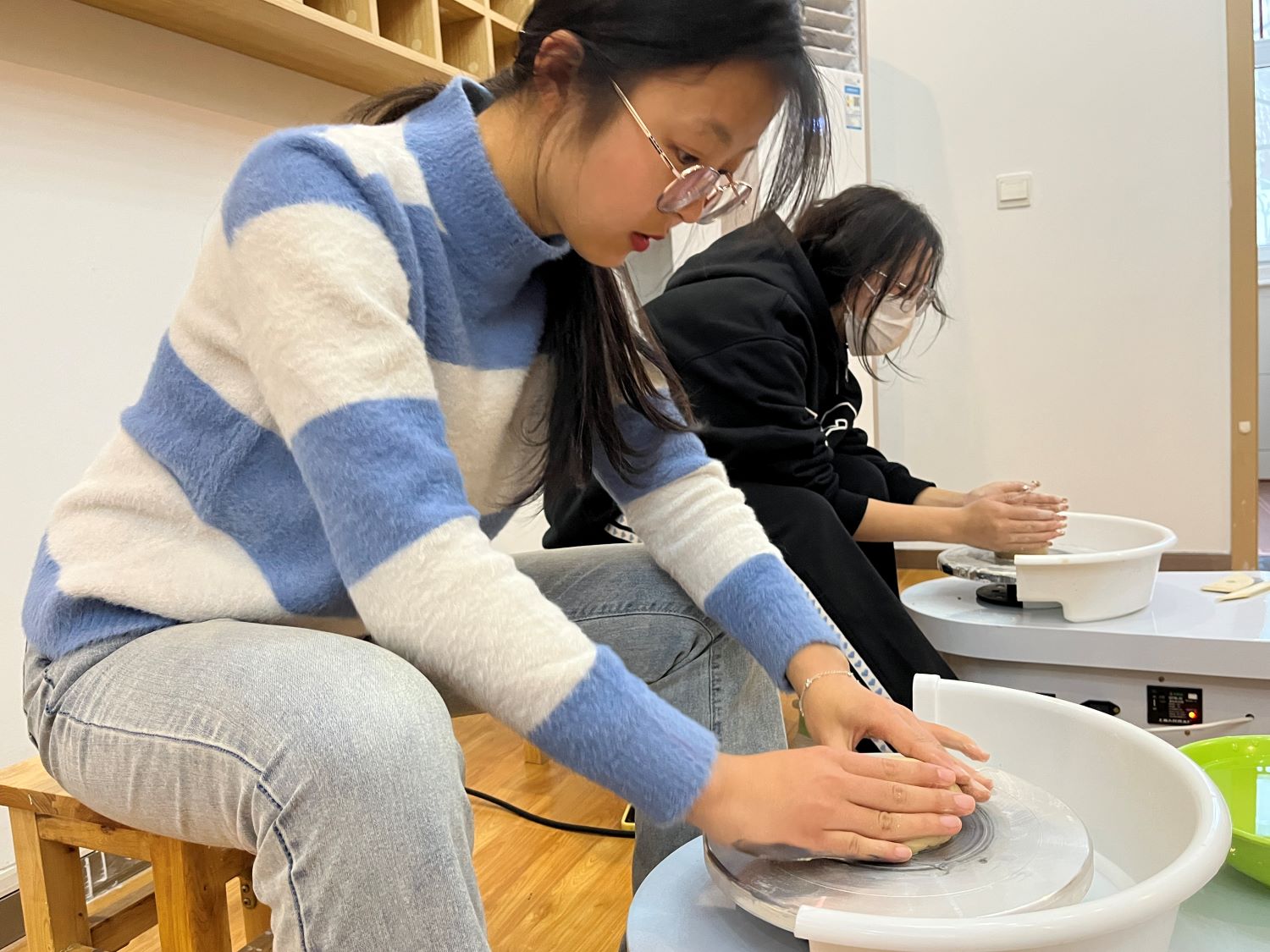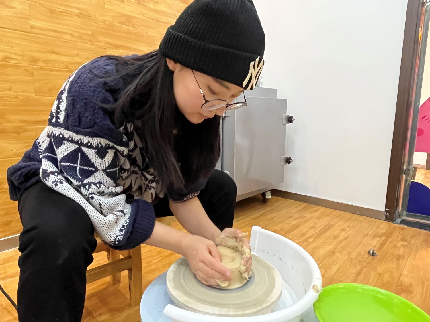 活动正式开始,同学们迫不及待地投入到动手环节。“先轻轻地将一块黏土放在拉坯机的转盘上,然后打开机器,转盘开始缓缓转动,紧接着双手沾上一些水,放在黏土上,开始慢慢地塑形。”在郭建美老师的精心指导下,同学们手指灵活地在黏土上滑动,时而轻压,时而拉伸,随着转盘的转动,黏土逐渐变得更加柔软,同学们的手指也更加自如地在上面游动。黏土在拉胚机上逐渐成型,同学们细心地调整着每一个细节,渐渐地,黏土变得越来越规整和光滑,形状也越来越清晰,同学们地心中充满了期待和激动,等待着作品的完美呈现。