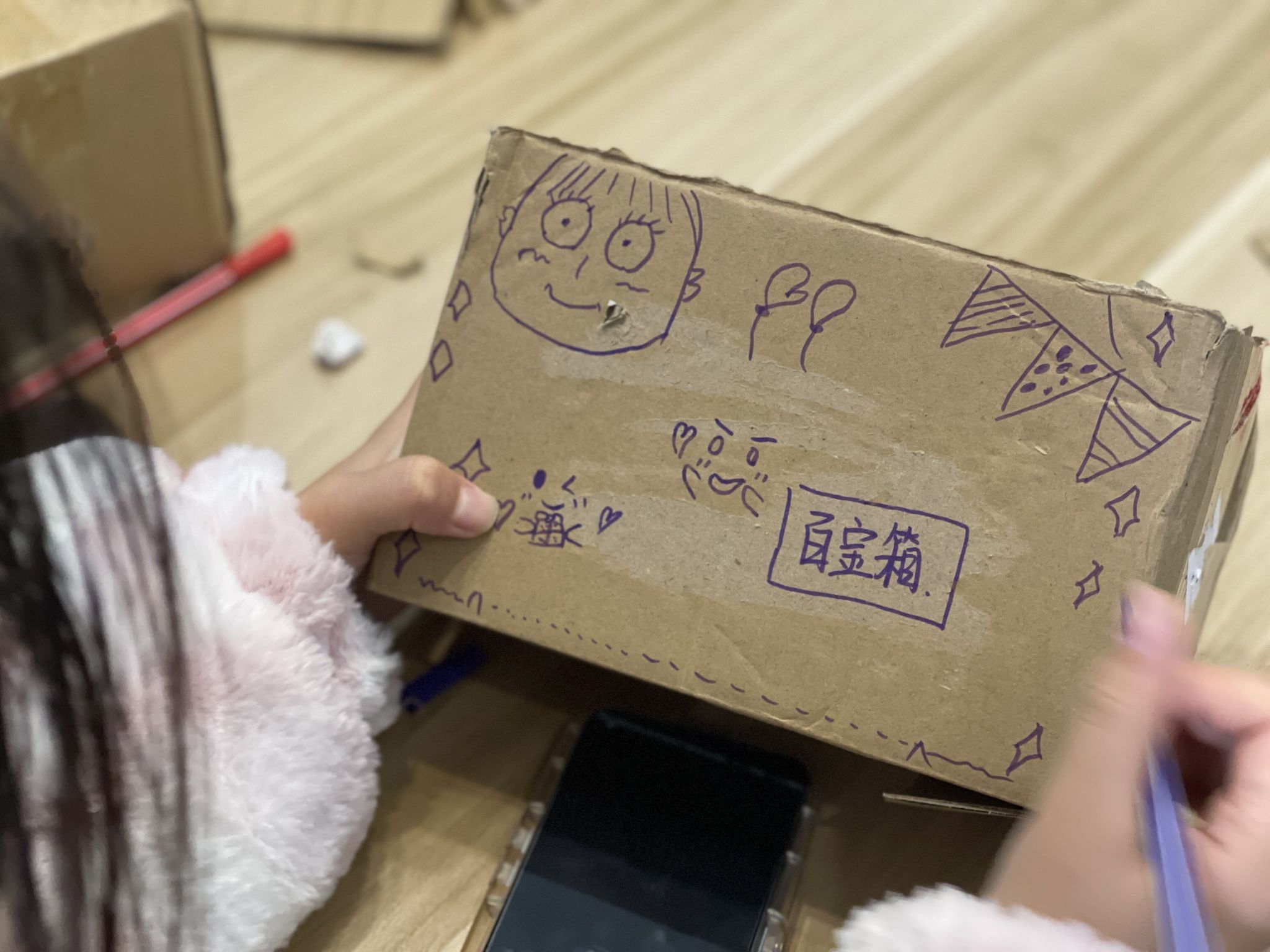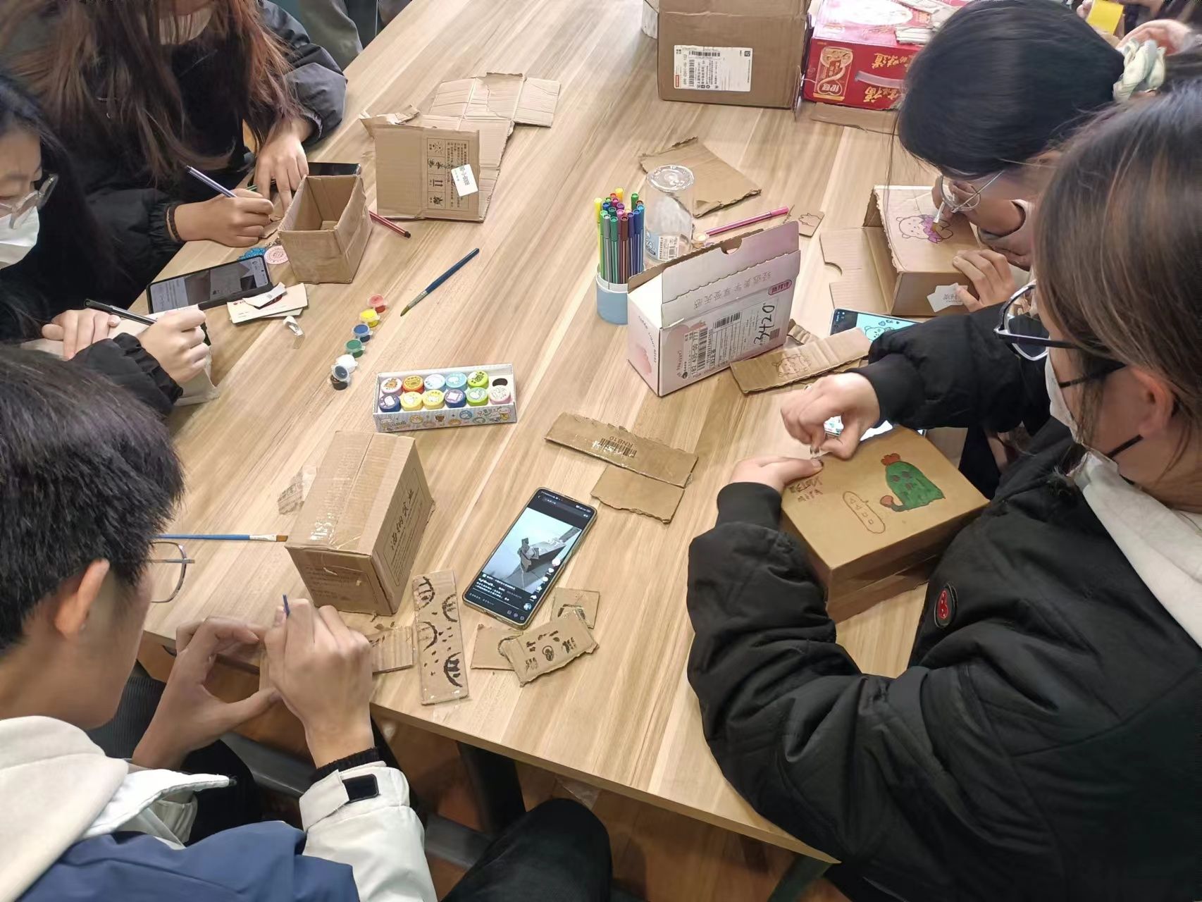 活动伊始,负责人雷祥宇向同学们介绍了活动的流程并分发了创作时所需的彩笔、胶带和各种装饰材料,让同学们沉浸式体验纸盒变化的快乐。随后,活动正式开始,同学们将提前准备好的纸盒摆放在桌子上,挑选着各种大小、形状的纸盒,仔细观察着这些纸盒的特点,然后将纸盒拆开,思考着如何利用这些特点进行创作,他们手中的纸盒就像是一块块未被雕刻的玉石,等待着他们用灵巧的双手和无穷的创意去发掘出它的真正价值。