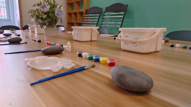 “艺术家们”轻轻握住画笔,如同拥有一支魔杖,在石头上舞动,每一笔、每一划都像是在施展色彩的魔法。绘制细节时会显得格外专注,大家眉头紧锁,双眼紧盯着手中的石头,仿佛要将它看透,手中的画笔轻轻颤动,小心翼翼地描绘着图案的轮廓。时而轻描淡写,时而重重勾勒,每一笔都透露出对绘画的热爱和专注。舒菲老师走到同学的身旁,耐心的为大家讲解石头画的技巧与要点。在老师的悉心指导下,同学们的画技得到了明显的提升,原本生涩的笔触变得流畅起来,图案的色彩也变得更加鲜艳动人。整个场景仿佛被定格在这一刻,充满了宁静和美好。