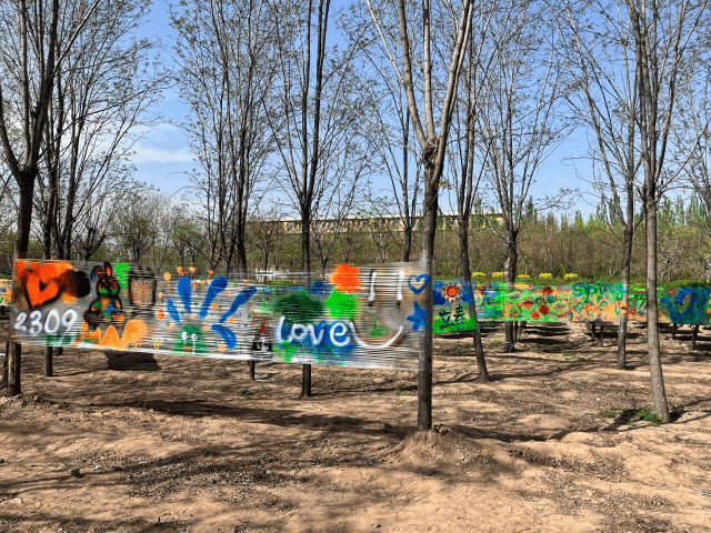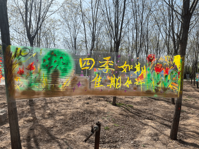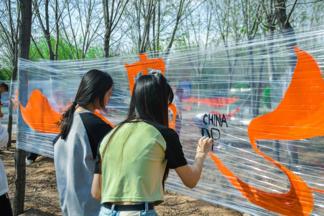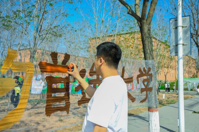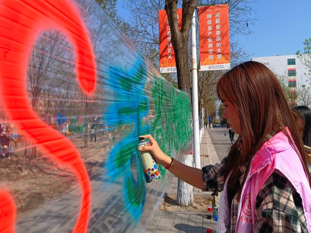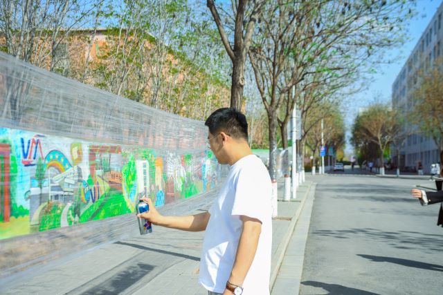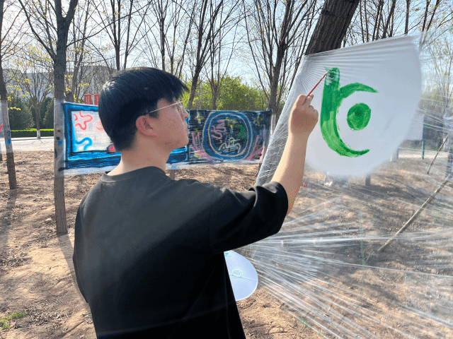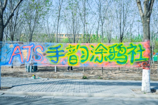 以临近的两颗树杆为画轴,缠绕上数圈保鲜膜,一张张特殊的“画卷”铺在春日的树林中。手执画笔,喷漆,由涂鸦社社长马笑凡同学带领ATS手韵涂鸦社的社员们在保鲜膜上开始作画,将为学生们带来了一场视觉盛宴。