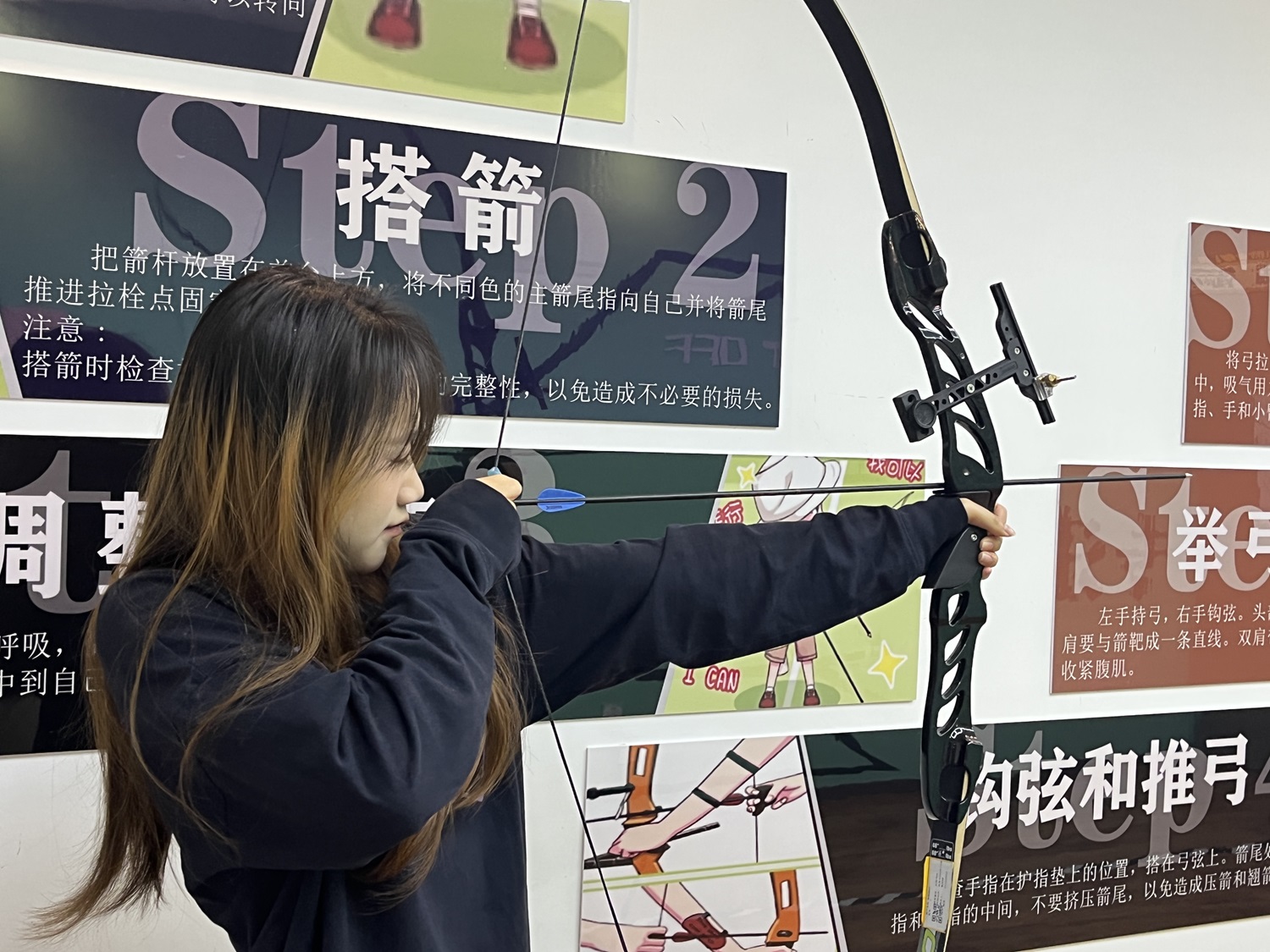 活动开始前,场地服务部副部长李子英组织同学们在白燕书院116未WAY·智慧搭建空间进行比赛顺序抽签。活动伊始,李子英宣布了此次比赛的活动规则:根据赛前抽签,首轮三人一组射靶十次决十强,次轮抽签定组射靶五次决四强,最后四强一箭定胜负。进入比赛场地,李子英依次向将要进行比赛的同学详细讲述了射箭的步骤和技巧,从正确的站立姿势到精准的瞄准方法,从标准的拉弓动作到一气呵成的射击。同学们在进行了解后便纷纷摩拳擦掌,跃跃欲试。