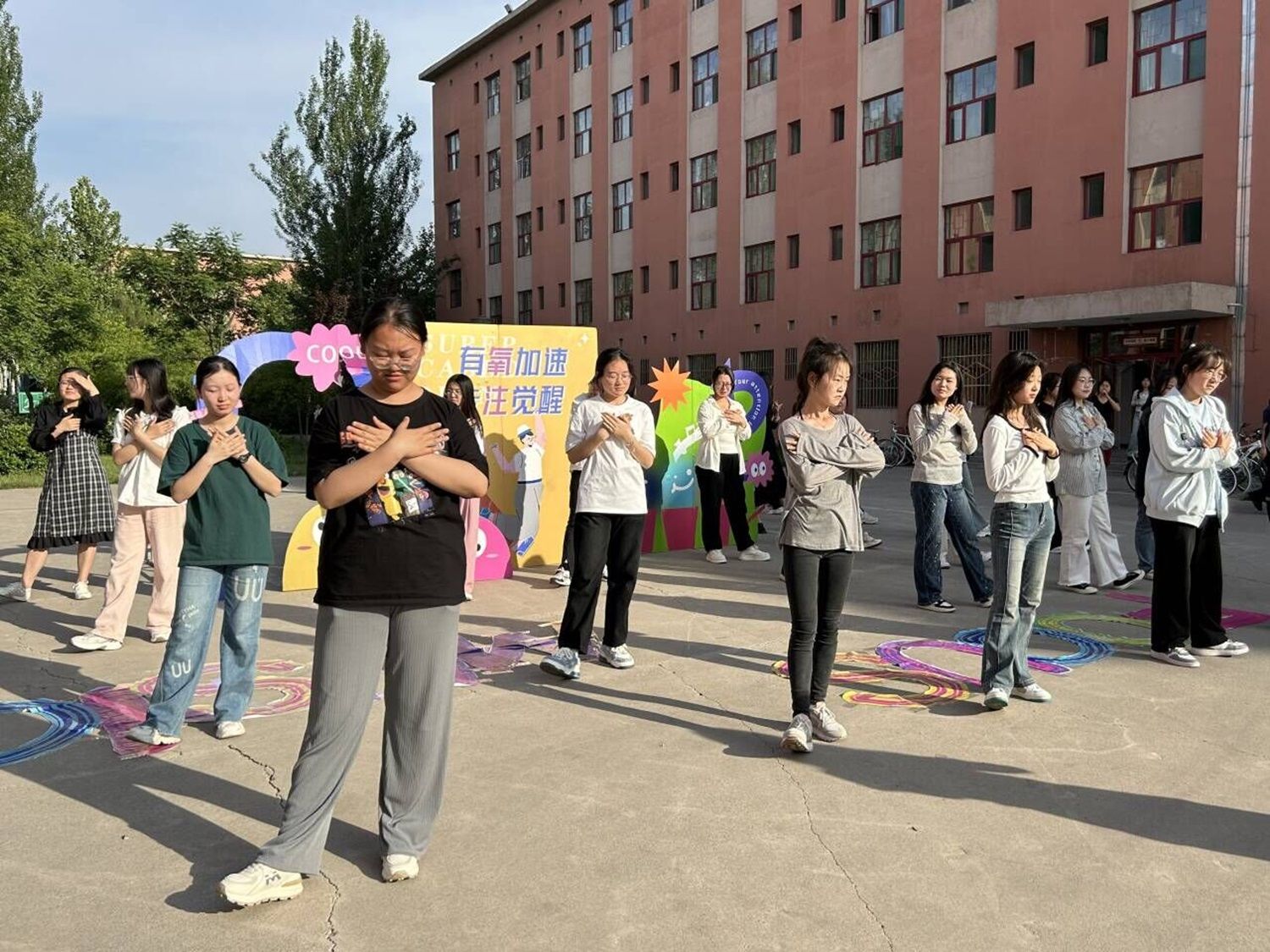 帕梅拉跳操以其独特的节奏感,吸引着同学们的注意力,李倩同学带领大家跟随音乐的节奏,做着一系列精心设计的动作。在明媚的阳光下,同学们轻盈跃动,她们或快速跳跃,或优雅旋转,或深蹲站起,每一个动作都充满了力量与美感,以舞姿诉说春天的故事,让人们仿佛置身于一个生机盎然的梦境。汗水从她们的额头滑落,这些动作既有传统的有氧运动元素,也融入了现代舞蹈的动感,让同学们在享受音乐的同时,达到了锻炼身体、提升专注力的目的。她们热情高涨,汗水与笑声交织在一起,展现了青春的活力。周围观看的同学们也被这活跃的气氛所感染,加入进去。同学们在优雅的舞姿中,不仅感受到生命的活力和春天的美好,更培养了一颗专注的心灵。