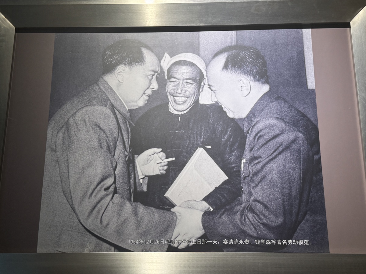 昔阳县博物馆,承载着昔阳这片土地厚重的历史记忆,宛如一本立体的史书,向世人娓娓道来昔阳的过往兴衰与人文变迁。踏入博物馆,首先映入眼帘的是一座巨型塑像,讲解员吕炳亮介绍:“陈永贵同志曾任我们大寨村的党支部书记,他在北京参加全国人民代表大会第三届一次会议期间,受邀参加了毛泽东主席的71岁生日宴会,这是毛主席与他热情握手的场景!”凝视着塑像,成员们深切体会到这份历史的厚重。