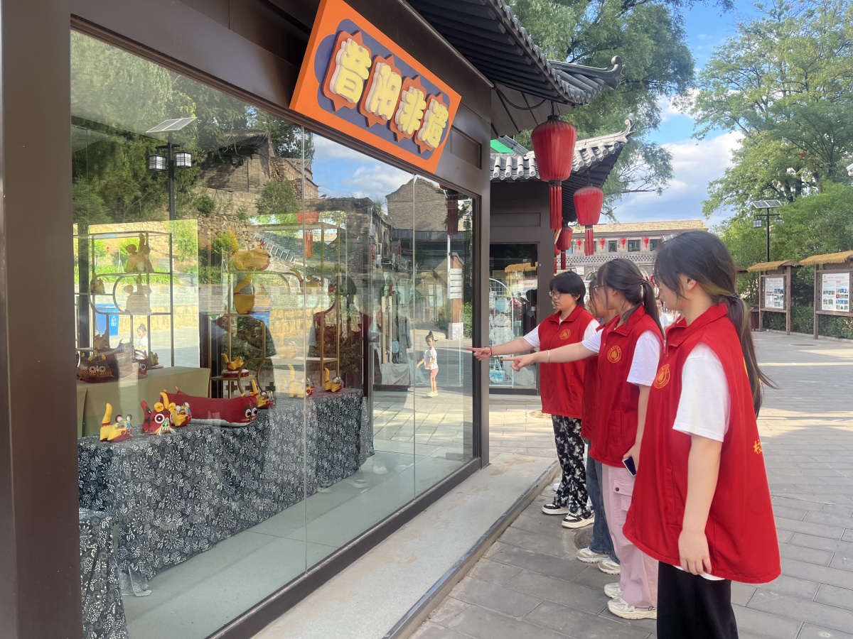 在毛家大院的门口,燕栖云宿乡村振兴促进团成员们整齐列队,与毛主席像的墙面庄重合影、致敬,以青春之姿向伟人致以崇高敬意,传承红色精神火种。踏入大院,时光仿若放缓脚步。一条特色街道排列着一个个历史文化的展厅。清朝服饰静静陈列,其细腻纹理、传统纹样,诉说着往昔服饰文化的审美与礼仪;非遗布老虎造型憨态可掬,色彩斑斓间,彰显民间工艺的独具匠心,让青年们直观的领略到了非遗传承的温度。