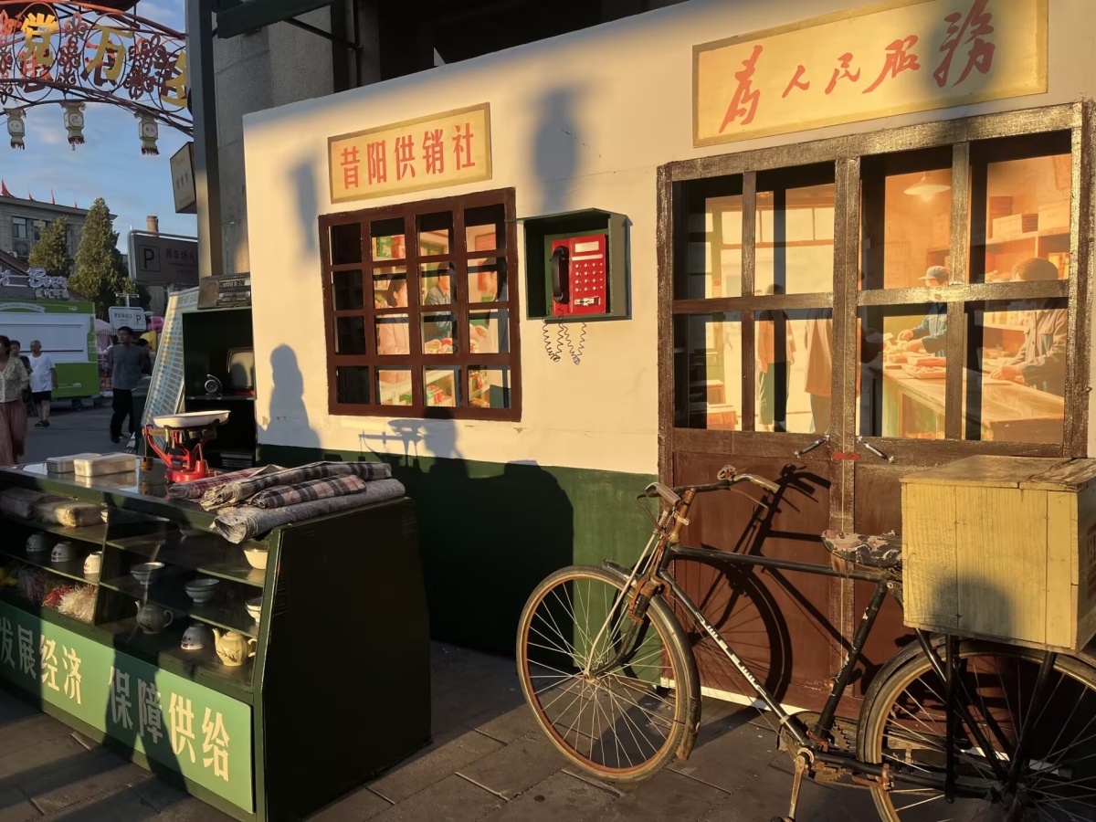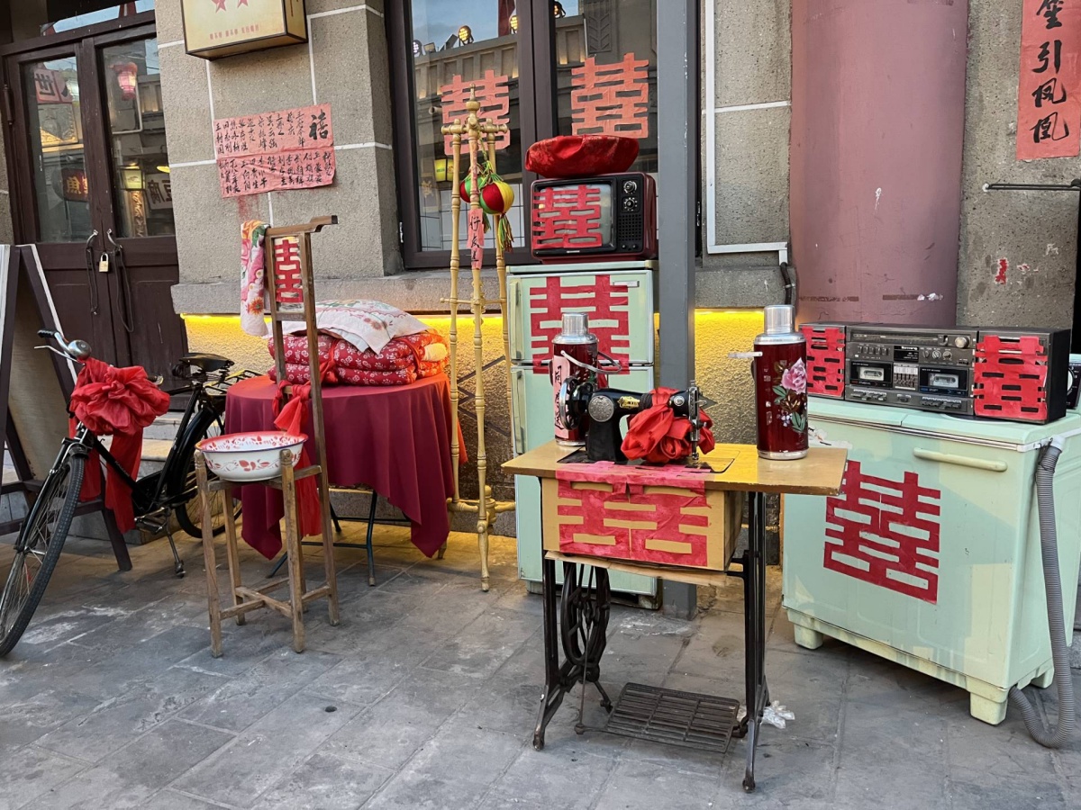 暮色缓缓笼罩老街,琥珀色的光给老街的屋顶、墙面都镀上了一层暖金,踏进餐馆,熟悉的桌面纹理,仿佛看见从前的自己,在教室里端坐着,踊跃举手回答问题的模样。大家相视一笑,纷纷拿出手机拍照留念,要把这段跨越时空的奇妙共鸣定格。沿着街道前行,满是红喜字的复古家具依次排开,老式自行车两条“铁腿”稳稳当当、缝纫机支起往昔的针线时光、电视机……那些都是20世纪结婚采买的物件,带着鲜明的时代印记,让整条街道都洋溢着浓厚的喜庆氛围,像是在无声诉说着往昔的浪漫故事。正沉醉间,前方传来欢快的音乐声,街头表演热烈开场,舞者们身着复古又鲜艳的衣衫,搭配微喇裤,以活力满满的姿态,迈着富有韵律的迪斯科舞步,与老街的复古景致碰撞出奇妙火花。恍惚间,仿佛能看到父母年轻时的青春身影,引得过往行人纷纷驻足,或拍照或喝彩,欢声笑语在暮色里肆意蔓延。