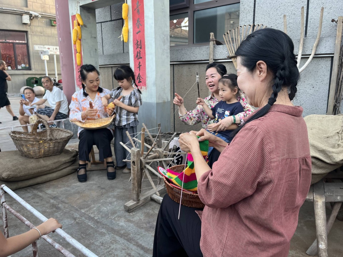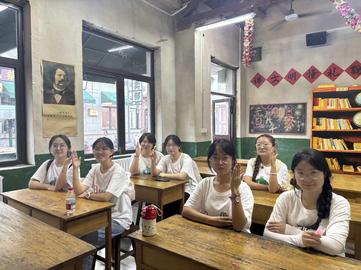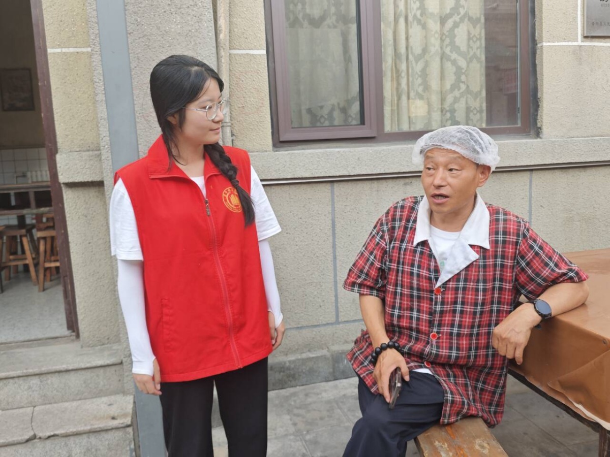 老街坊们围坐交谈,有的和孩子一起掰玉米粒,有的织围巾,有的给孩子讲大寨故事,一片温馨。同学们在街边还注意到一位修鞋师傅,他手臂挥动,手中握着一块布,复古的氛围十分浓厚。日头渐斜,师生们与老街坊围坐在老槐树下,斑驳的树影筛下阳光,也筛出一段段大寨往事。王大爷呷了几口搪瓷杯的茶,年轻时参与农田建设的劲儿仿佛又回来了,谈及往昔,眼神发亮:“当年大寨人战天斗地,‘自力更生、艰苦奋斗’ 不是喊喊口号,是一锨一镐、流汗流血干出来的!” 他扬起手臂,虽瘦骨嶙峋,却仍能让人想见当年挥舞锄头、垦荒造田的模样,“那时候天不亮就出工,为了多打粮食、改变穷日子,男女老少齐上阵,可没人喊苦!”攥紧锄头的手连青筋都在较劲,垦荒造田的号子声似在耳畔回响,让“大寨精神” 从课本铅字,化作具象的血汗故事,在树荫里流淌。