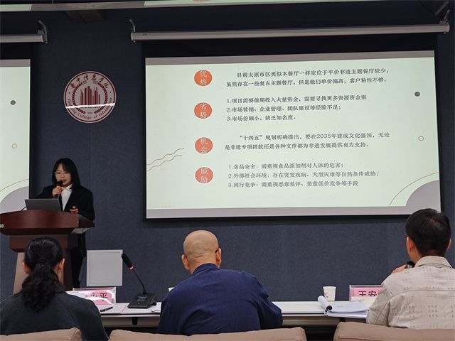 品牌的厚度只有用讲故事的方式来叙述,书院成员郭凡露自信大方呈现了独属于山西美食的魅力,对项目餐厅进行了介绍与描述;“本项目是山西非遗美食集合店的概念,设想将首家店面开设在太原博物馆附近,可同时容纳60人,为顾客提供非遗美食以及亲手制作美食的服务,同时提供非遗美食技艺咨询以及打卡拍照的服务”,不仅展示了团队的智慧,更让山西美食在大赛上绽放了独属于它自己的烟花。团队成员研究方向分为仪动画、计算机、行政管理大数据、会计、国际贸易、财务管理等方面,涵盖不同学科,都利用自身专业优势为项目的前期筹备贡献力量。在104支队伍里最终排名11,虽然没有得奖,但相比较结果来说,我们更看重过程,在过程中成员们已经形成了一股坚不可摧的力量,成为书院中一支凝聚力极强的队伍。