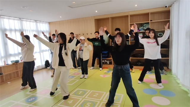 最有效的锻炼方法是什么?当然是高强度间歇性训练HIIT,其原理是通过高强度、无氧爆发式训练,配合短时间内间歇时间,以此来达到燃脂效果。在动感音乐的感染下,同学们开启了新一轮挑战,“弓箭步”“高抬腿”“开合跳”逐渐过渡到“深蹲跳”“波比跳”……