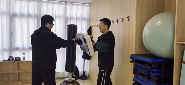 自由运动时间到,瑜伽球、滚腹轮、拳击墙靶……大家纷纷选择喜欢的器械进行训练,最受欢迎的还是书院最新添加的拳击设备,“躲闪”、“摆拳”、“勾拳”,大家纷纷模仿着电视比赛中选手的模样,新手小白也在大家的鼓励下勇敢尝试,哪怕动作不标准、哪怕体力跟不上,带上拳套,就尽情享受心跳加速带来的暴汗感。,肉体和金属的对抗,胜出的往往是意志。