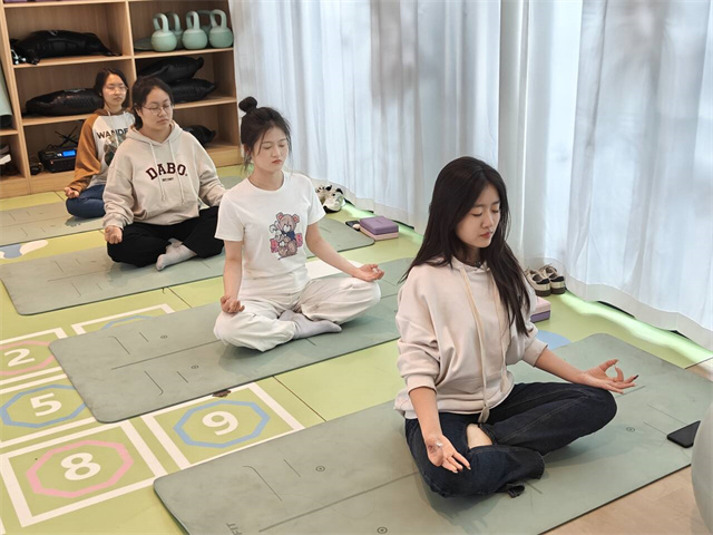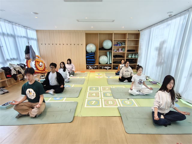 课程开始,肖老师带领学生们进行冥想。在轻柔的音乐声中,学生们闭上眼睛,深呼吸,逐渐放松身心。冥想的过程中,学生们仿佛置身于宁静的大自然中,感受到了前所未有的宁静与平和。肖老师讲解到“用鼻子呼吸,吸气时,把新鲜空气缓慢深长的吸入肺的底部,呼气时,腹部向内、朝脊椎方向收紧,把肺内的浊气完全排出体外,内脏器官复原位,尽量让呼气的时间比吸气的时间长”这种刺激透过神经,作为一种和缓的呼吸节奏的自我调节信号传至大脑,大脑在接受这些刺激之後便远入一种平和、沉静的状态。