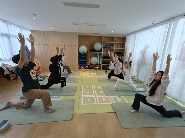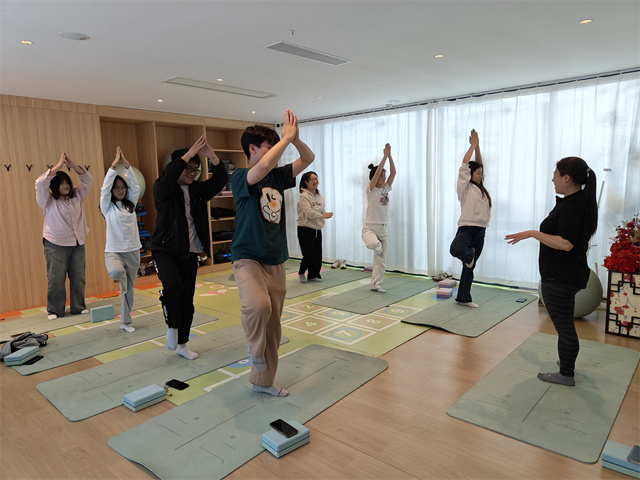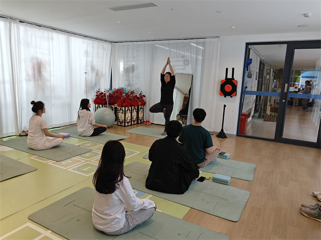 课程的最后阶段,进行了站立的平衡式练习。他们单脚站立,双手合十举过头顶,努力保持身体的平衡。这个动作看似简单,却需要极高的专注力和稳定性。学生们在挑战中逐渐掌握了平衡的技巧,感受到了身心合一的美妙境界。“扎稳根基向上延展”是此次活动听肖老师最常说的。说这句话的目的是从地面向上建立稳定的根基,这种向上伸展的力量不仅能有效伸展脊柱,上提胸腔,也平均分配了身体承受的重力,为身体创造轻盈感。脚下有力,身体有支撑,头脑清明,心安定,这是双脚根基稳定带来的效应。只有根基稳定,身体的能量才能通畅,也才能为头脑和心带来安定感,练习时才能专注在当下。