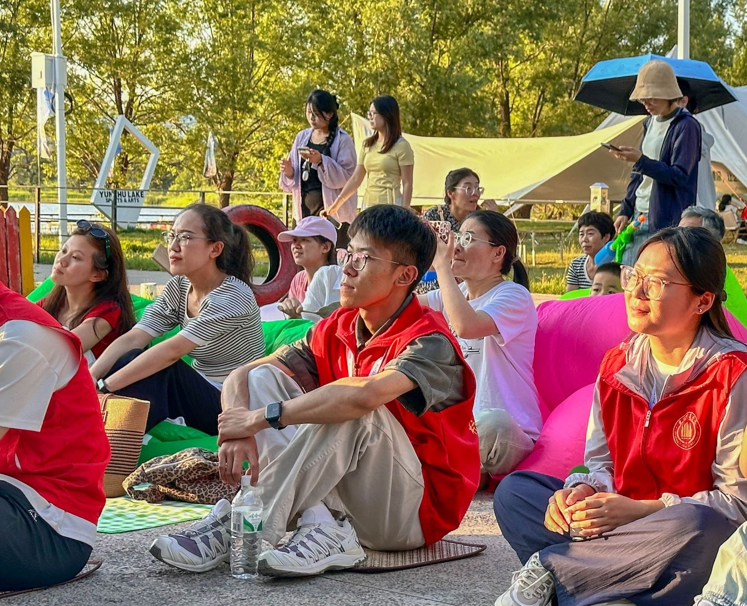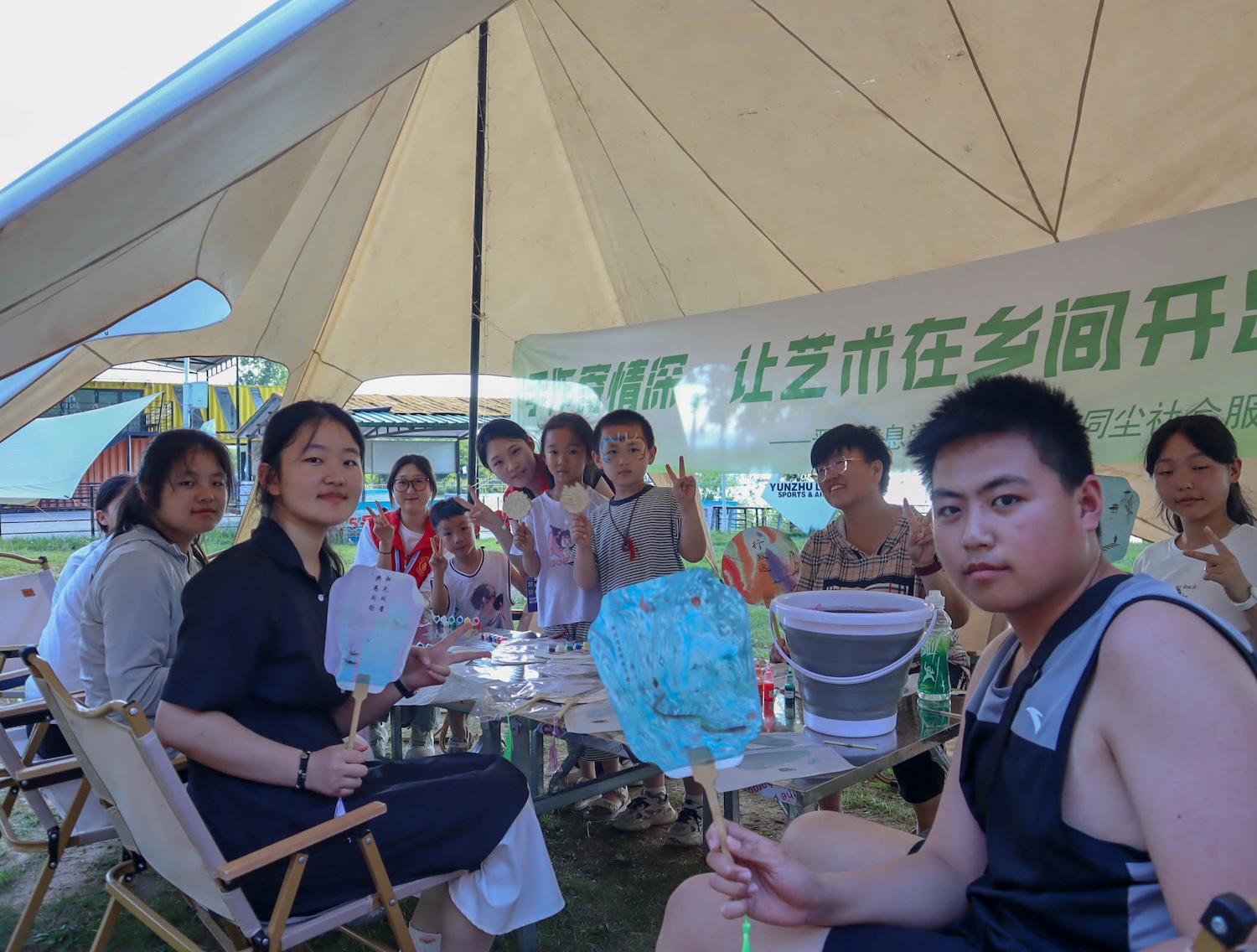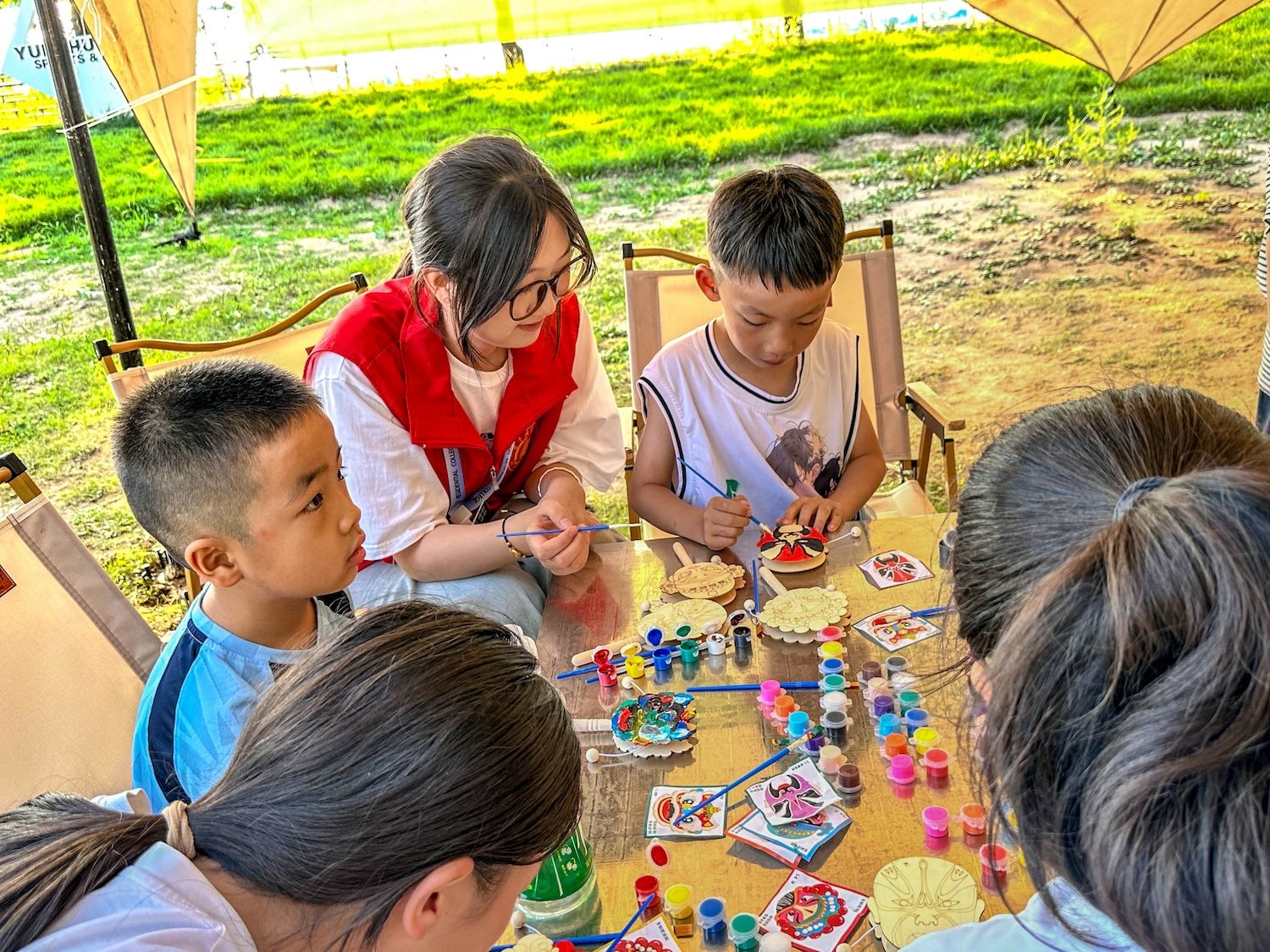 晨光初绽,践行团成员背着画具、捧着漆扇走进村落,开启了一场非遗与乡村的浪漫之约。为孩子们讲解戏曲脸谱色彩密码与历史故事,揭开漆扇工艺神秘面纱,让孩子们在绘制中感受传统文化魅力。在东汇村,中药与艺术相遇,成员们协助老人用陈皮、决明子等拼贴中药画,寄托美好祝愿,让老手艺在指尖重焕生机。傍晚,云竹湖畔的“榆”你分享故事音乐会温暖开唱,舞台成为全民表达热爱的窗口,孩子们稚嫩的歌声、游客充满故事感的嗓音与践行团成员的歌声交织,用音乐串联起乡村与远方,让艺术之美浸润了这座淳朴小乡镇的每一寸土地。