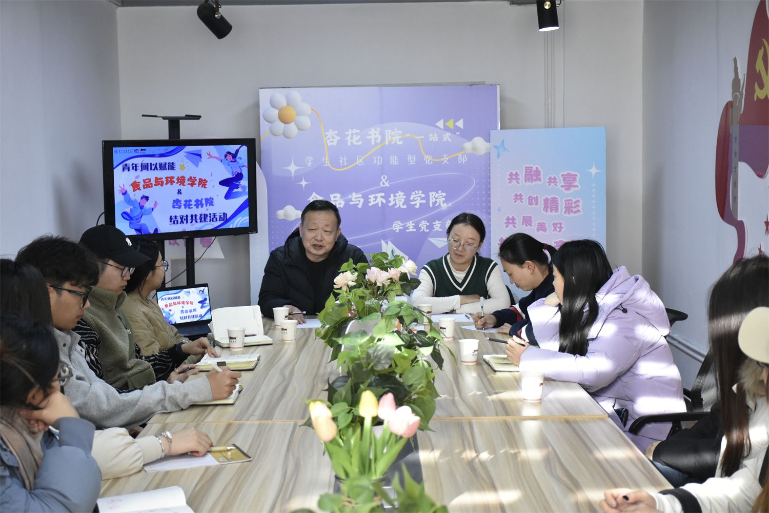 2024年11月28日15:00,杏花书院“一站式”学生社区功能型党支部携手食品环境学院学生党支部在杏花书院和鸣·先锋驿站开展“青年何以赋能”结对共建主题活动。此次活动邀请杏花书院名誉院长高昂老师,杏花书院综合办主任聂宁老师、发展导师王丕达、王晨悦、于叶璠老师、食品与环境学院王雪丽老师及双院学生代表共聚一堂,深入探讨青年的责任担当以及在新时代背景下如何发挥青年的积极作用。高老师首先提出了以言赋能的概念,作为青年,我们应在实践中寻找故事,以自身行动书写传奇。随后,高老师分享了我国在军事科技领域的成就,指出青年一代要敢于梦想,勇于实践,将个人的奋斗融入国家的发展大局,同时,高老师鼓励同学们不仅要关注行业趋势,更要注重个人能力的提升。通过此次活动,我们要将所学知识与实际结合,在这个飞速发展的时代,让世界见证青年的风采。