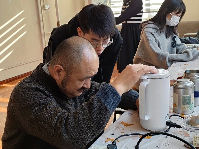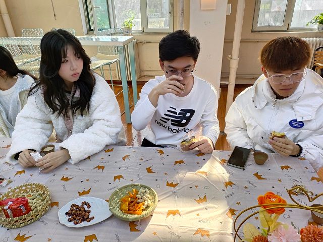 烤茶叶、磨茶粉、加水煮沸,最后加酥油搅拌,每一步操作看似简单,但只有操作时才发现其实并不是那么容易。单就一个烤茶叶来说,火候特别重要,火候大了茶叶会糊,火候小了,茶叶中的水分不能完全烘干,并且为了保证茶叶受热均匀,还需要操作者双手不断翻炒。在院长的带领下,同学们终于制作出一壶热气腾腾的酥油茶。斟满茶碗,浓郁奶香沁人心脾,纯正的味道在同学们的舌尖扩散,手捧茶碗慢慢品尝后,口有余甘,让人回味许久。这时,白院长与同学们再次交流道:“当你品尝酥油茶时,你会感受到它的口感。它的口感厚重而滑润,就像在品味浓郁的巧克力或者是热乎乎的燕麦粥。而这种滑润的口感,主要来源于酥油中的脂肪和蛋白质。让我体验到一种咸甜交错的独特风味。”