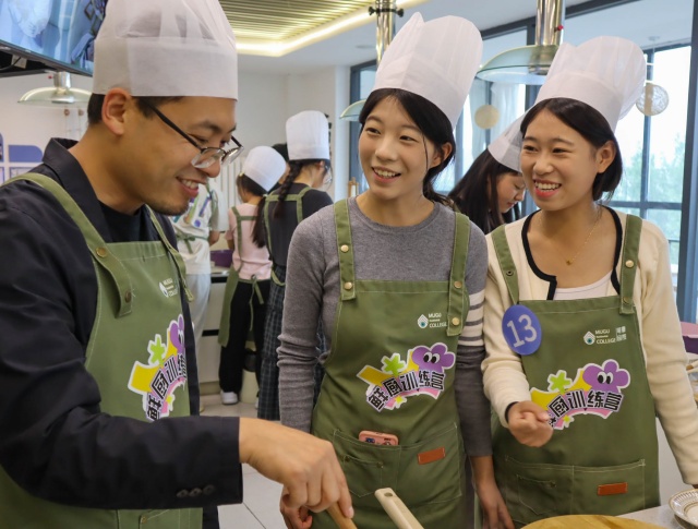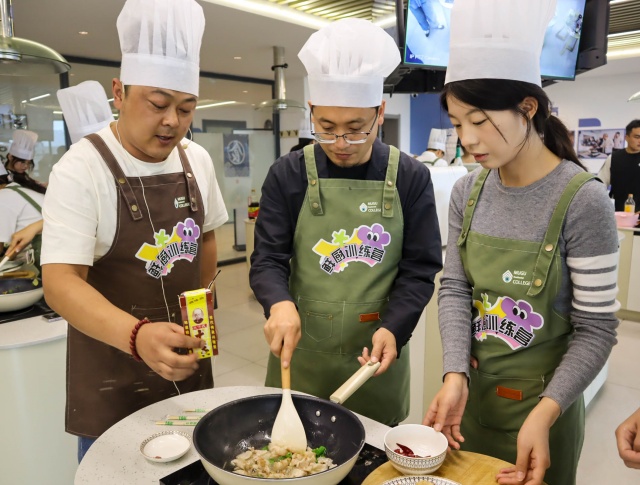 蒸腾的热气模糊了镜片,厨房里满是热闹的烟火气!平日里妙笔生花的魏思孝院长系上围裙,化身“厨房萌新”,与同学们一同围在“鲜厨训练营”东北营主厨身旁取经。刘进师傅手持长勺翻炒鸡块、撒入榛蘑,示范着小鸡炖蘑菇的地道做法。魏思孝院长像个认真记笔记的“文学系转烹饪专业”新生,烹饪的间隙,他与同学们分享童年灶台边的故事,从母亲炖菜时飘出的香气,到街边小吃摊的烟火记忆。学员董雨悦在与魏院长的交谈中提到自己平时虽也热爱烹饪,却未曾像今日这般,感受到食物背后隐藏的故事。魏思孝院长说:“每一道菜都是一个故事,每一次翻炒都是对过往的回忆。文学与美食都能唤醒我们内心最深处的情感”。这一刻,文学与美食的灵感在对话中悄然生长。