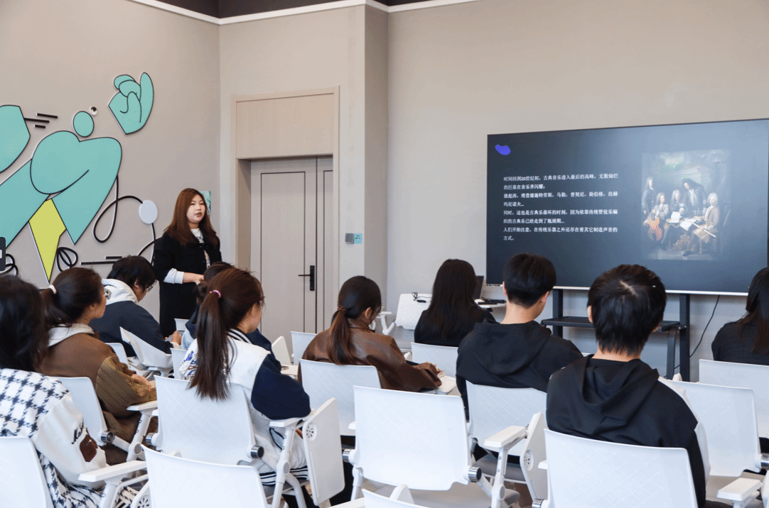 接着,于老师带领同学们回顾了电子音乐的发展史。20世纪初,古典音乐进入最后的高峰,同时,其创作也陷入了瓶颈,人们开始注意到,在传统乐器之外还存在着其他制造声音的方式,于是电子音乐应运而生。于老师还提到了三个重要的电子音乐流派:法国具象音乐、德国电子音乐和美国电子音乐,并一一介绍了其特点与代表音乐家,为同学们呈现了一个丰富多彩的音乐世界。