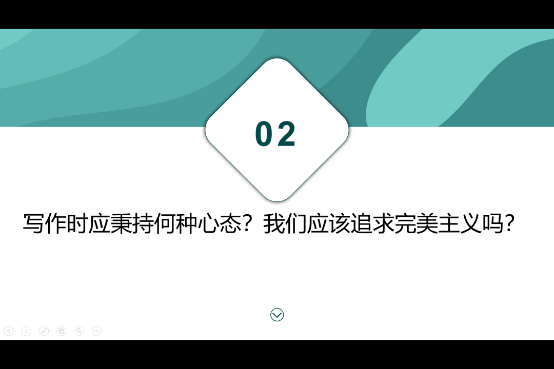 之后,郭老师提出第二个问题:写作时应秉持何种心态?我们应追求完美主义吗?老师与同学们根据自己的创作经验进行了分享。尉老师表示自己当下的写作心态是短期不完美,长期完美。是将写作当成一种生活常态,是生活的一部分,是一种生活化写作。既然是生活,是常态,就好比每一次呼吸,每一次走路,没有办法每次都追求完美,但可以每次写一篇的时候都使它尽量完美。总而言之,不要求每段都达到非常完美,惊为天人,这样往往容易卡文,也追求不来,所以状态常态化,只要最终写出来的东西贴合内心就好。同样,这不怕偏离主题,就好比在枪战,如果要求每一发子弹都完美,可能无法顾及战场形势,我们能做的就是慢慢调整,直到状态最后可以调整到正中靶心。