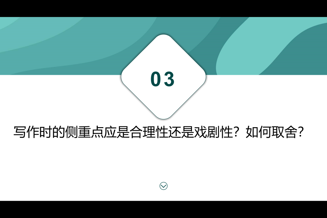第三个问题,写作时的侧重点应该是合理性还是戏剧性?如何取舍?扈老师认为这个问题相当庞大,对她来说,戏剧性或许更重要。因为人们为求生活平稳,总会祈求日常生活中事物的合理程度不要脱出自己的掌控范围;而人们看故事,有时就希望看到违反合理性、同时又能让自己的情感收到刺激的东西,比如反派大声密谋恰好被主角听到,主角破局,或者恋爱故事里男女主一定会因为意外亲到。这些情节本身都很有意思,但因为观众看得太多了,才会被归为烂俗。