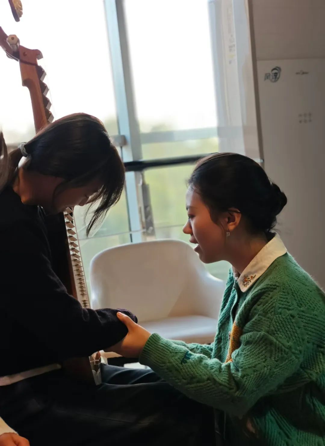 讲座的第三板块聚焦于琵琶的教学和演奏技巧方面。刘老师以弹拨乐器琵琶为例,为同学们详细讲解了如何把握一把位音、如何过弦以及如何换把等基础知识。老师通过现场演示,展示了琵琶的基本演奏姿势和手法;然后结合具体的乐曲《大鱼》,详细讲解了如何在演奏中运用这些技巧。在刘老师的指导下,同学们不仅学会了如何正确把握琵琶的音准和节奏,还了解了如何运用不同的演奏技巧来表达乐曲的情感和意境。通过琵琶学习和演奏技巧实践,同学们对琵琶相关的知识有了新的认识与了解,也对琵琶产生了浓厚兴趣,纷纷表示希望能够在后续的系列讲座中继续学习和探索这门古老而美妙的艺术。