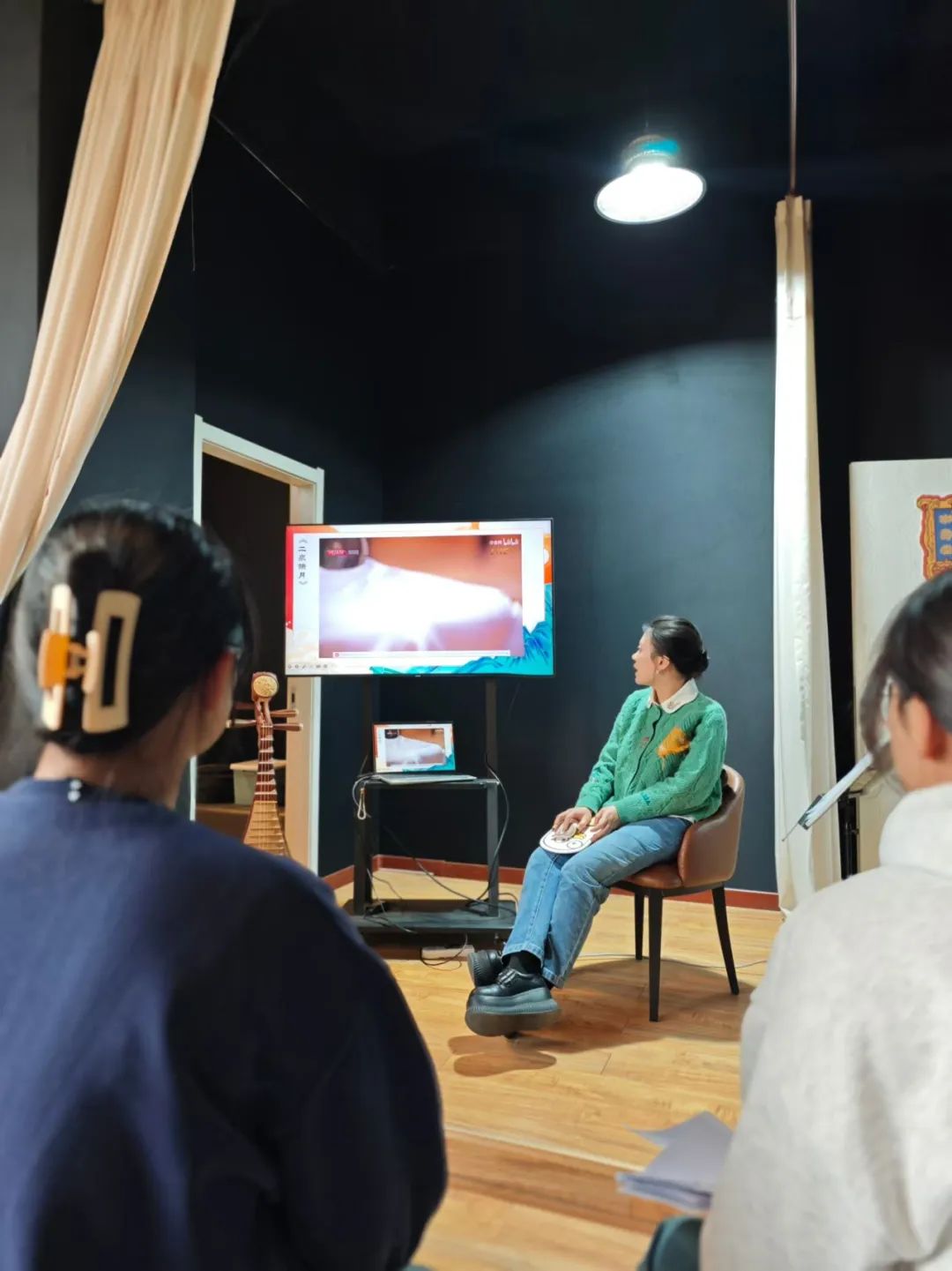 为了让同学们更好地理解和感受这些乐器的音色特点,刘老师特别采用了乐器拟人化的形式,将柳琴比作一个灵动女子,声音清脆高亢;将三弦描绘成一个幽默风趣的天津中年男人,声音醇厚。这种生动的讲解形式是本次讲座的亮点之一,刘老师以其独特丰富的内容设置赋予拟人化的乐器以背景故事和性格特征,不仅让同学们对乐器的音色有了更直观的认识,也将原本枯燥乏味的音乐理论知识变得生动有趣、易于理解。