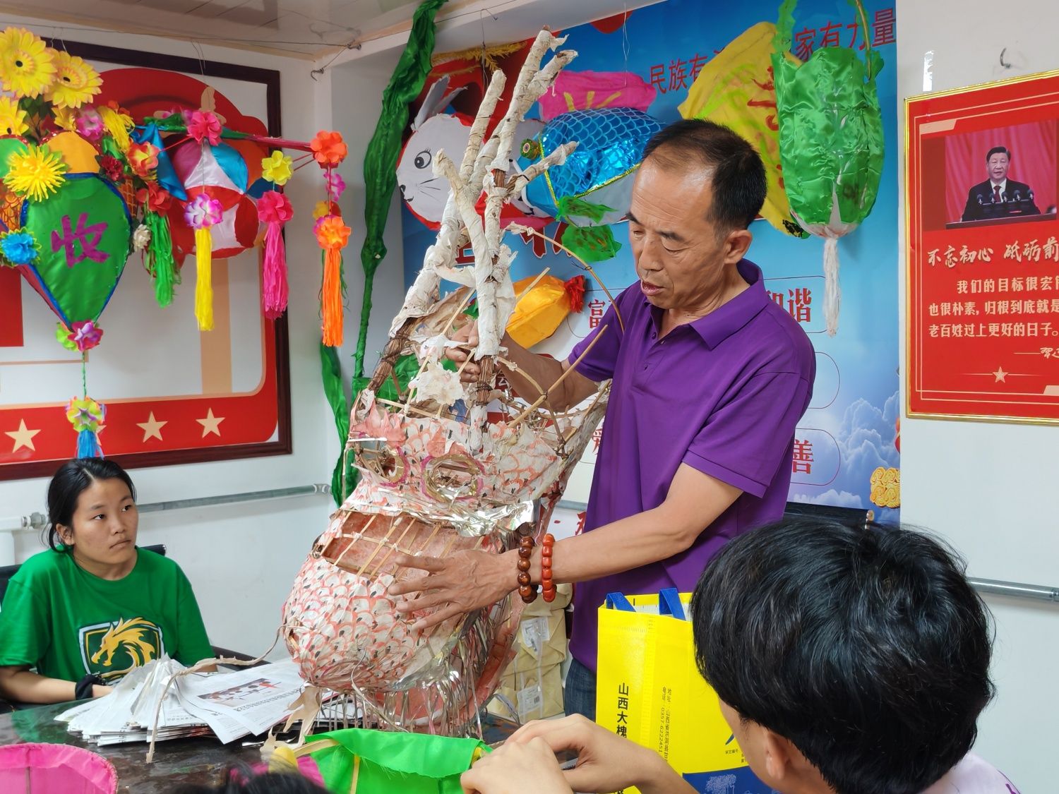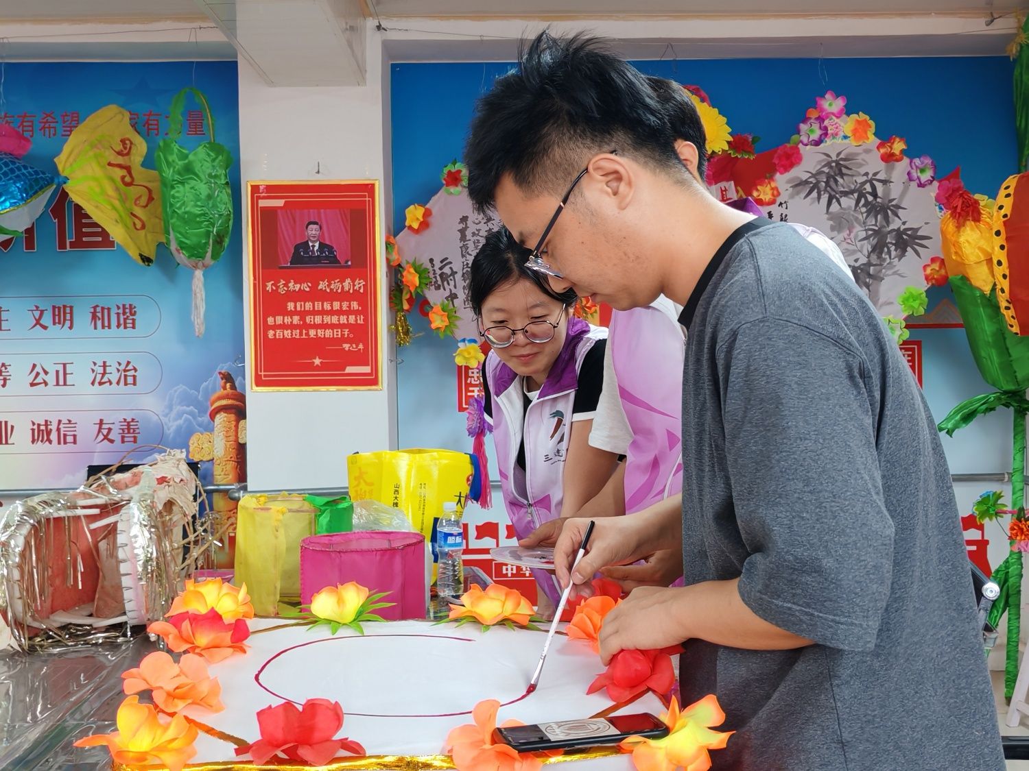 晋中信息学院“达灵”乡村振兴促进团此行深入东河南村,亲身体验非遗传承实践。特邀花灯非遗传承人王东照、瓮上称进行现场教学,系统讲解花灯的历史渊源、精湛工艺与丰富文化内涵。在传承人手把手的指导下,青年学子们将校徽、书院徽等元素创新融入传统花灯设计,让青春创意与古老技艺在京西福地碰撞出火花。