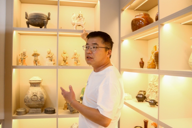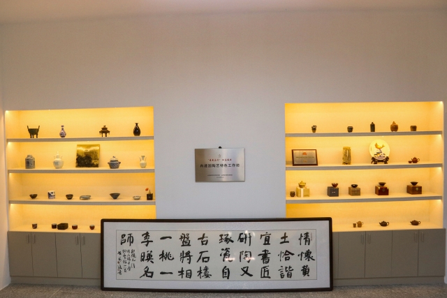 展厅内陈列着一件件古朴而充满地域特色的陶艺作品。陶轮飞转间,泥土在冉老师布满岁月痕迹的指间被赋予了新生。十年耕耘,他将陶艺课淬炼成文化传承的熔炉,商周青铜纹样、红军东征浮雕、黄河浪纹陶罐……我们看到的不仅是泥胚,更是三千年的文明密码。2015年,他在景德镇屡屡碰壁,开窑时满地碎瓷,直到发现家乡黄土富含二氧化硅,上百次试验终炼成“中国红”釉色;2024年,“冉建国特色陶艺工作坊”挂牌省级基地,陶艺课成为石楼中学学生争抢的热门,学生刘宇涛因他的启蒙考入陶艺专业:“在石楼,是冉老师让窑火照亮了我们的路。”促进团成员们屏息凝神,目光追随着那双神奇的手,认真聆听冉老师的讲述,见证一块平凡陶泥如何蜕变为承载千年智慧的器皿。