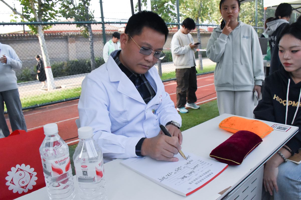 “舌淡红、苔薄白——昨晚又熬夜刷题没跑了吧?”中医义诊区的队伍蜿蜒绕圈,同学们攥着手机踮脚排队,就为等执业中医师唐海清医生“把把脉、看舌苔”。